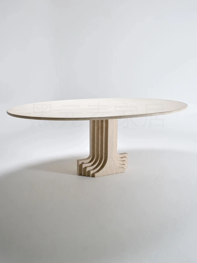 Elegant Natural Stone Dining Table - Wabi-Sabi Design with Oval Shape, Premium Marble Finish, and High-End Roman Column Style for Sophisticated Dining Experiences.