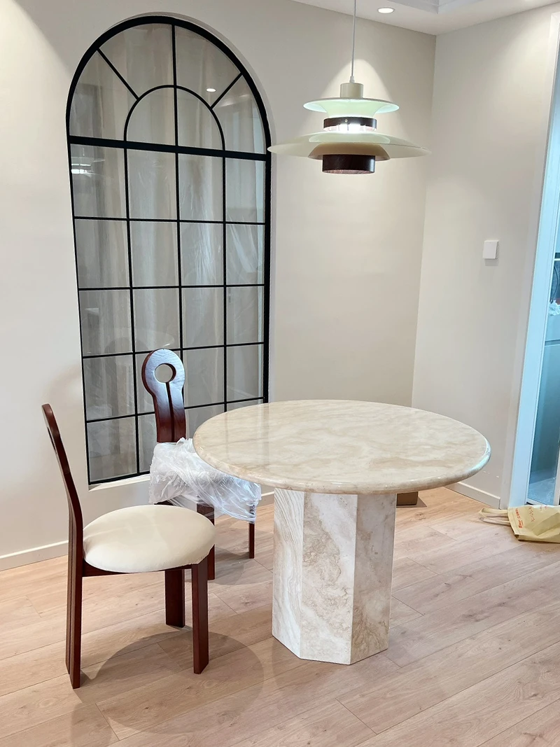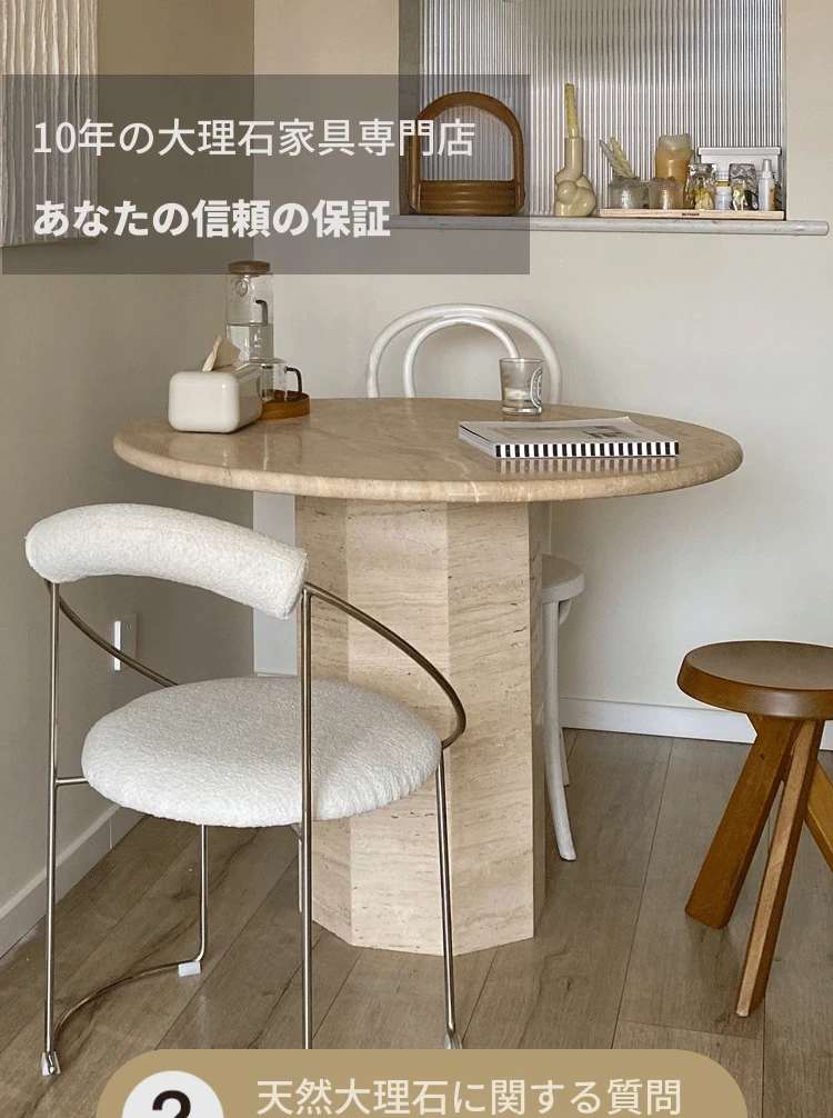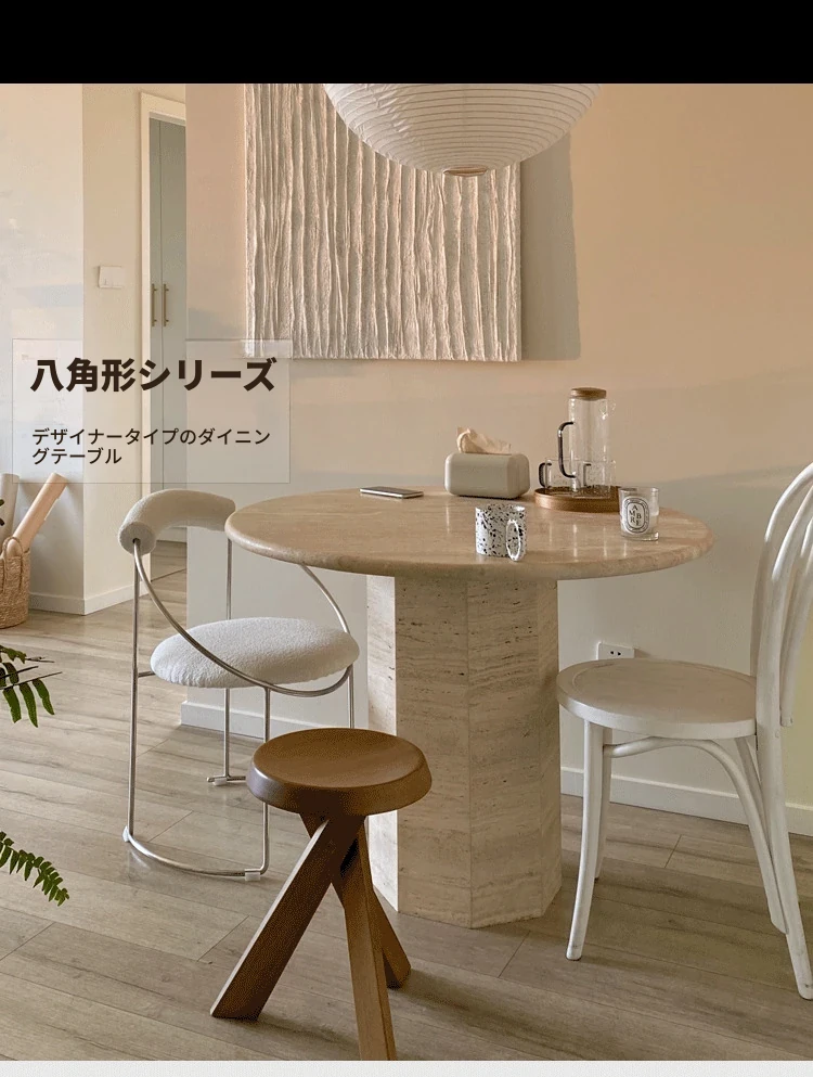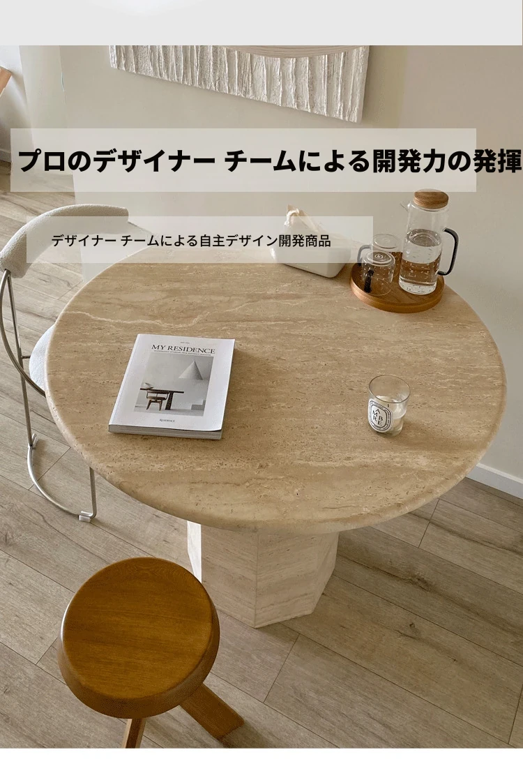デザイナー天然大理石テーブル - 和の美しさを引き立てる侘び寂びスタイルの中世風ラウンドテーブル。輸入の洞石を使用した軽量デザインで、贅沢な大理石の魅力を体感できます。あなたのリビングに洗練された雰囲気をプラス!