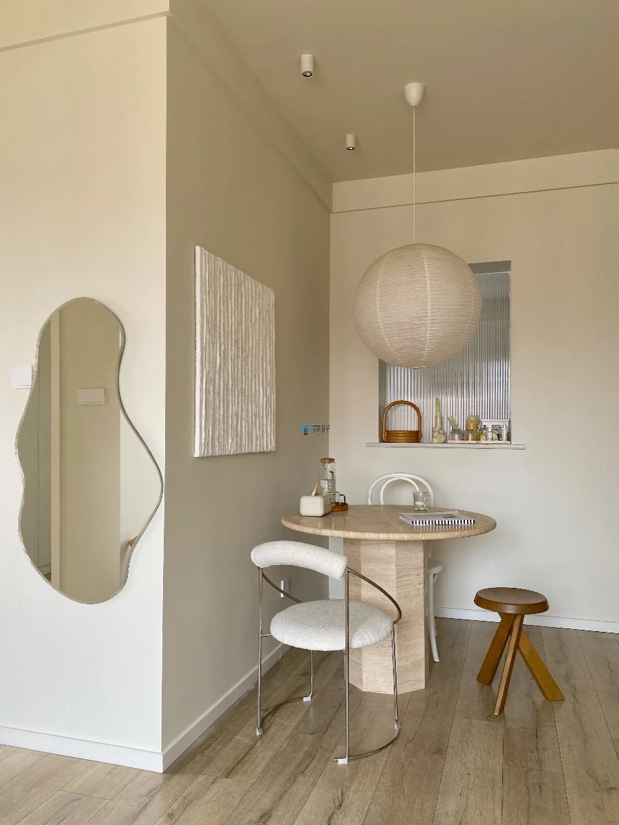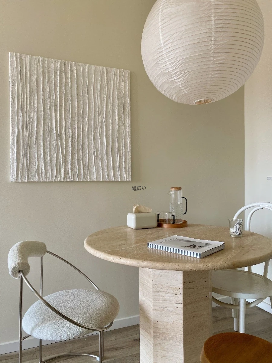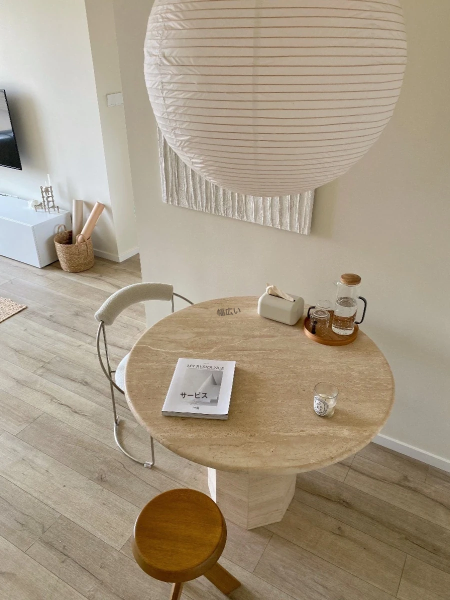 デザイナー天然大理石テーブル - 和の美しさを引き立てる侘び寂びスタイルの中世風ラウンドテーブル。輸入の洞石を使用した軽量デザインで、贅沢な大理石の魅力を体感できます。あなたのリビングに洗練された雰囲気をプラス!