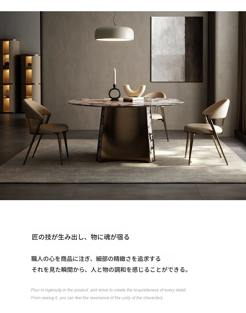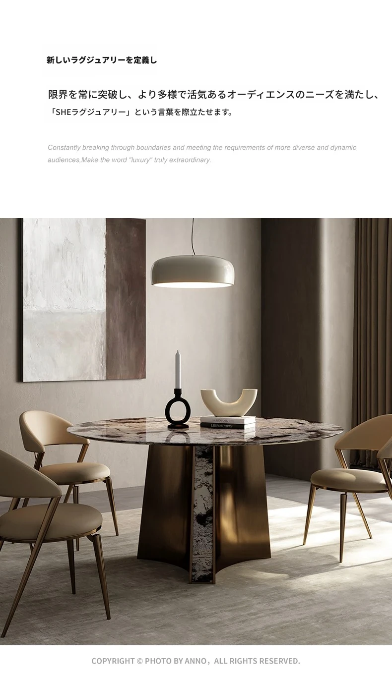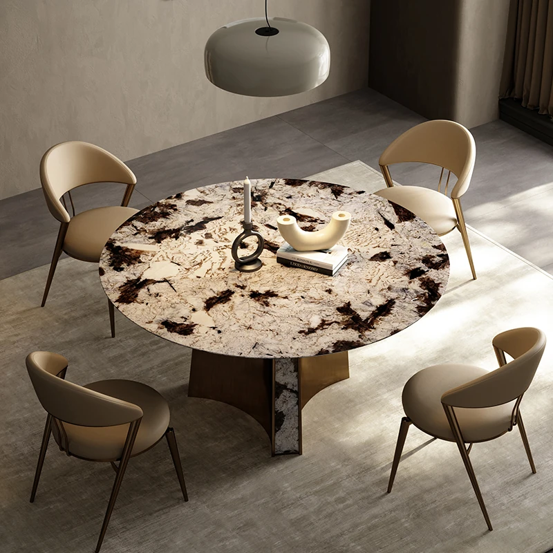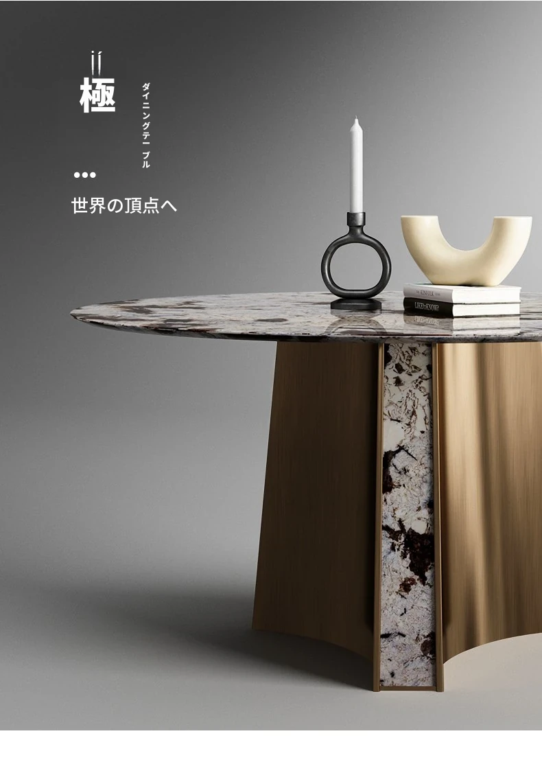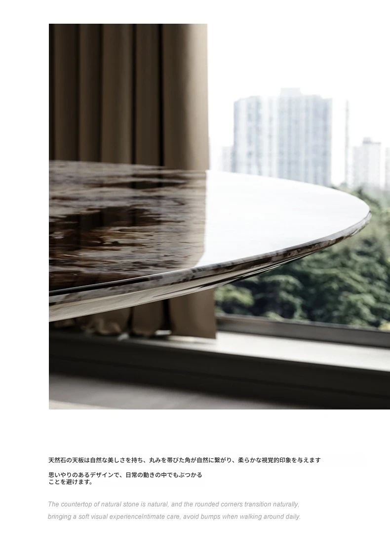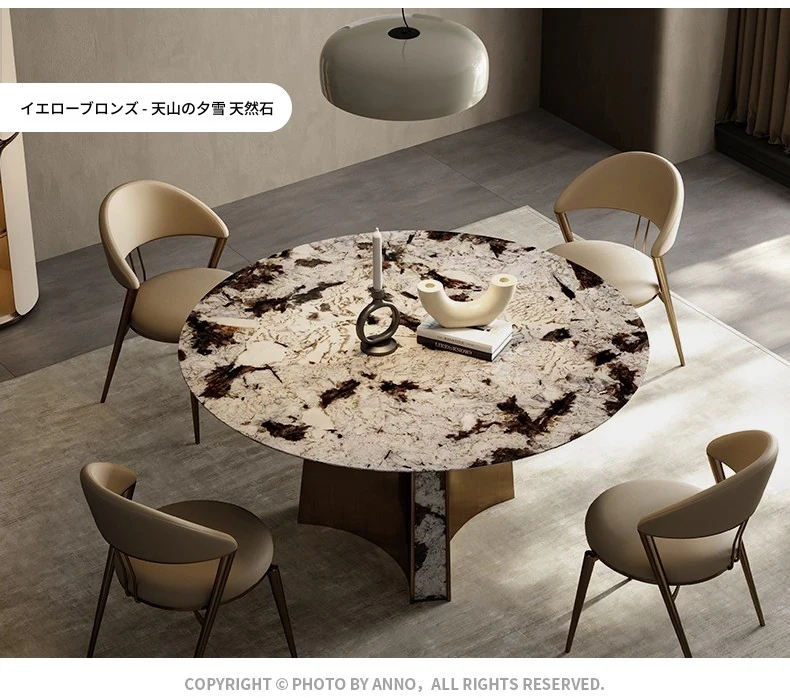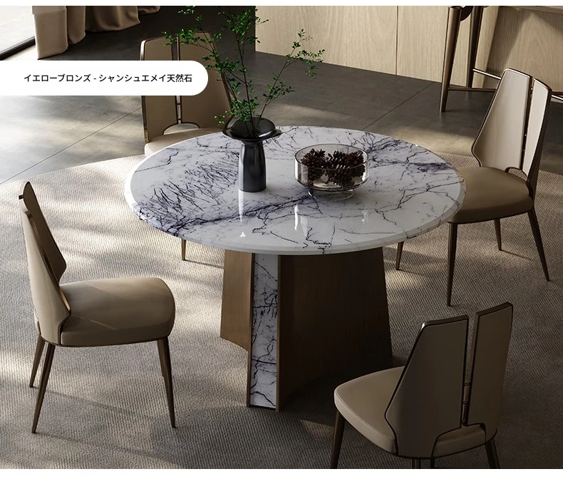 天然大理石製のラウンドダイニングテーブル - デザイナーズラグジュアリー、モダンな高級ヴィラ向け、広々としたリビングにぴったりなイタリアンスタイルの円形テーブル。食事を特別なひとときに演出します!