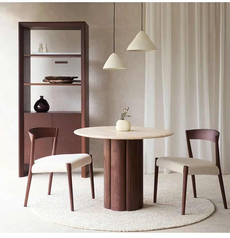 天然洞石を使用したデザイナーのクリエイティブな小型ダイニングテーブル。実木ベースで、フランス風の侘び寂びを感じさせる円形テーブル。おしゃれな食卓を演出し、狭いスペースでも優雅に。あなたの食事の時間を特別にします!