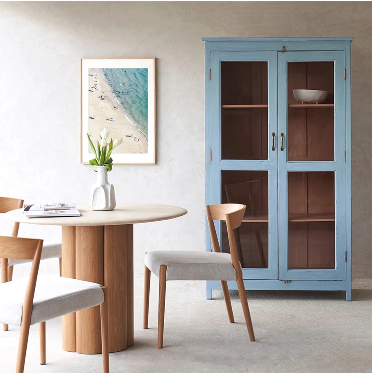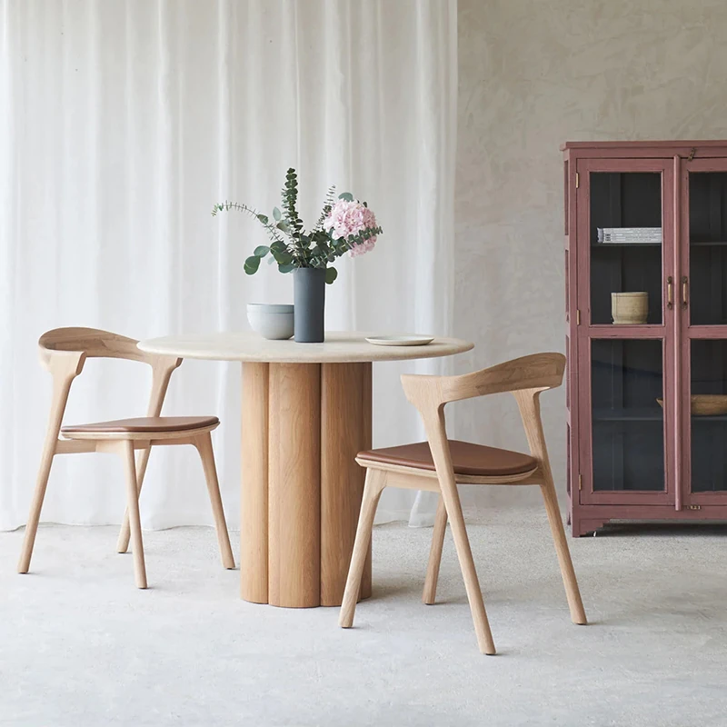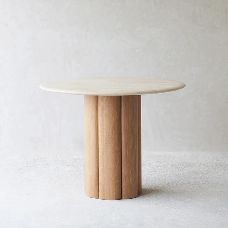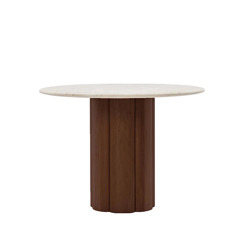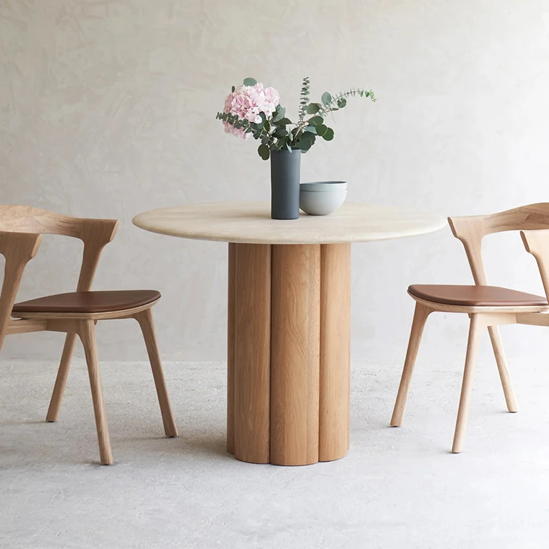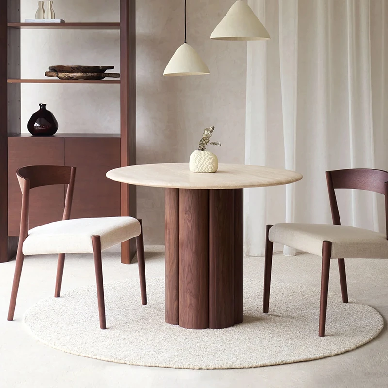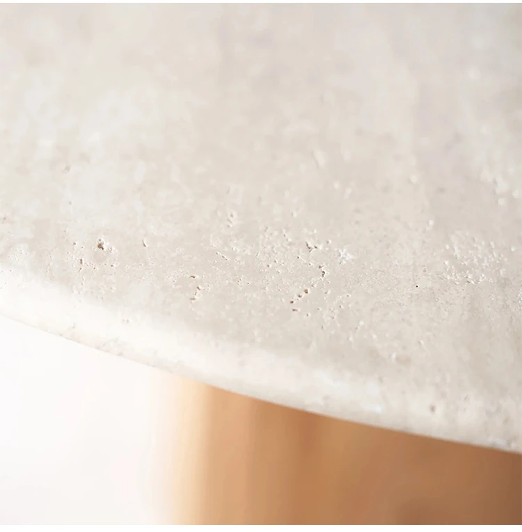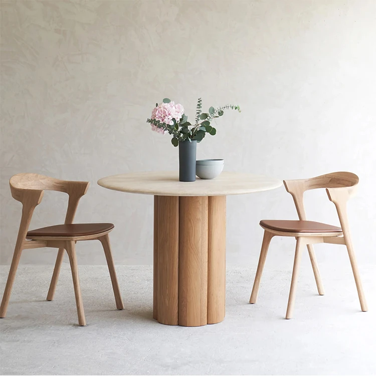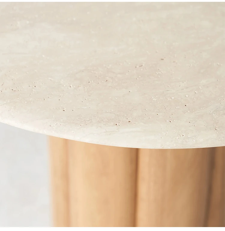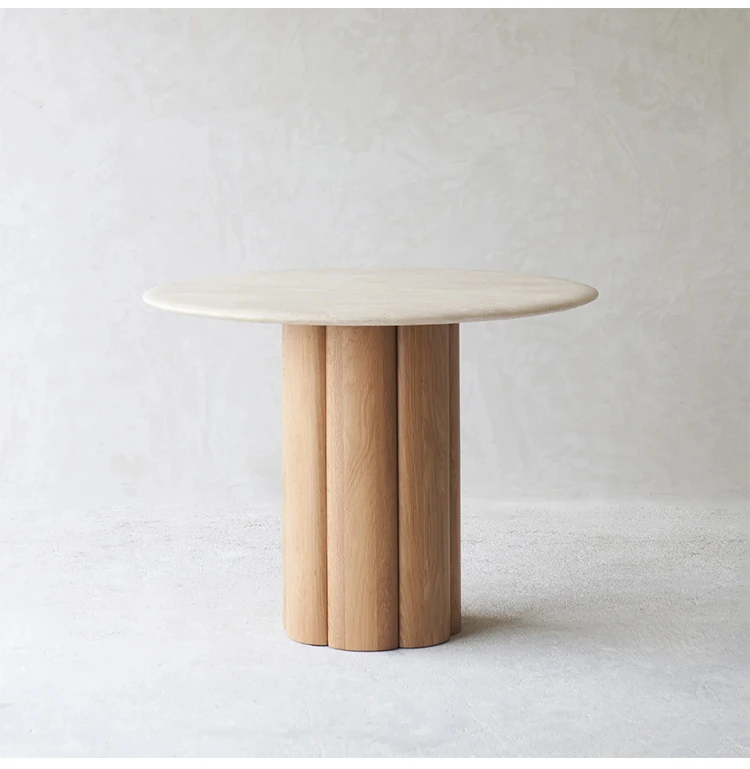 天然洞石使用のデザイナー創作ダイニングテーブル - おしゃれな小型レストラン向け、無垢材ベースのフレンチ侘寂風ラウンドテーブルで、特別な食事体験を演出します!