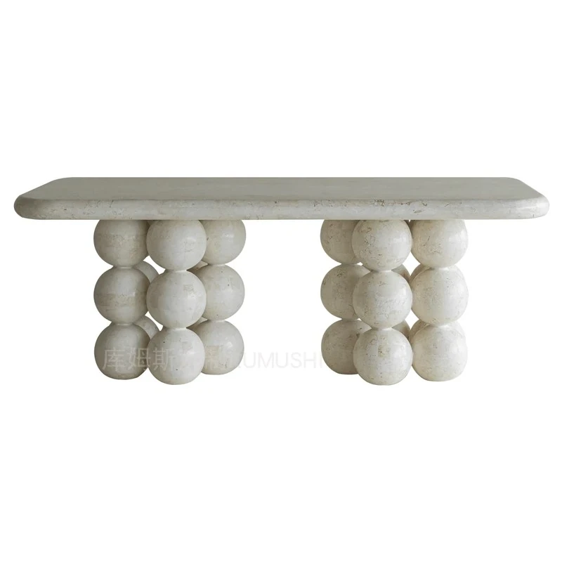 天然大理石製フレンチスタイルのダイニングテーブル - ヴィンテージ風の球形脚デザイン、個性的な長方形テーブルで贅沢な別荘レストランに最適!