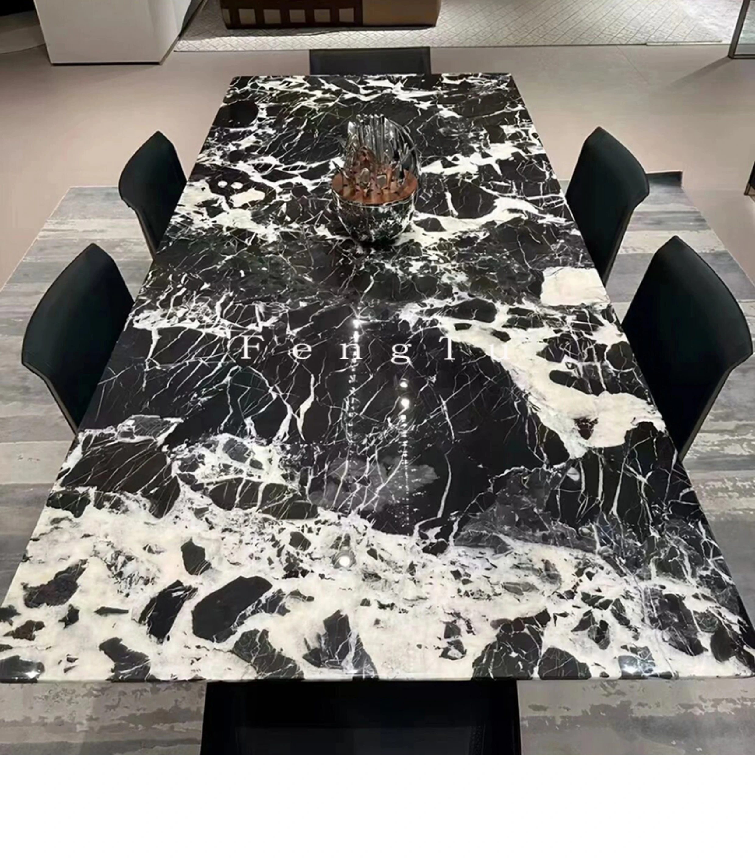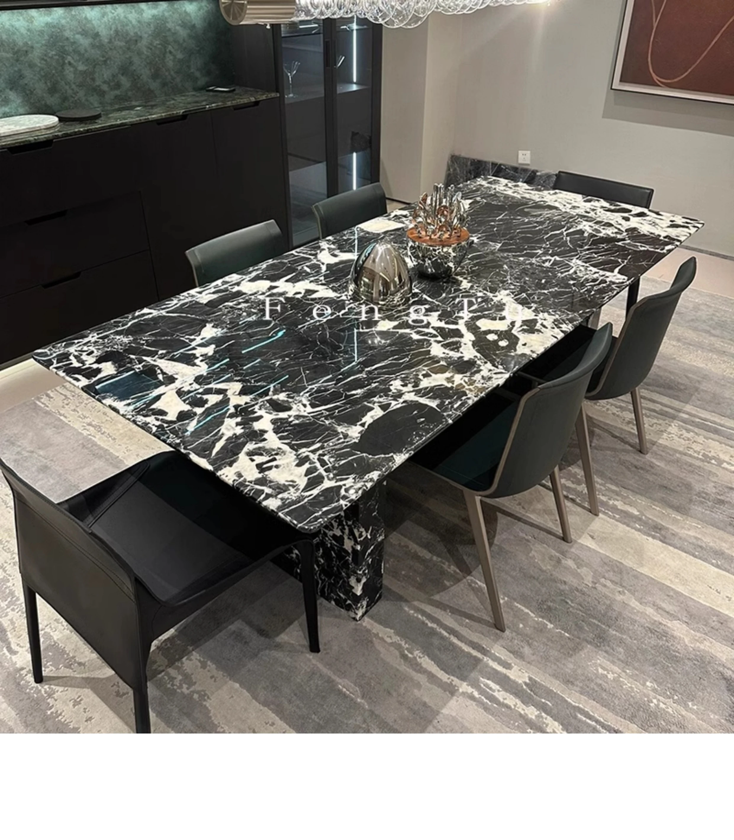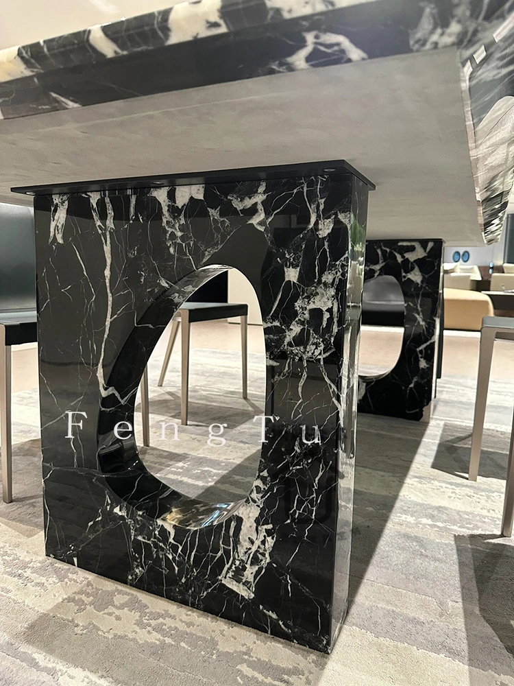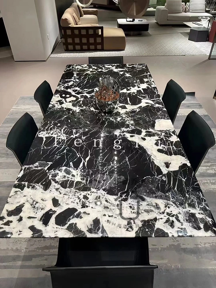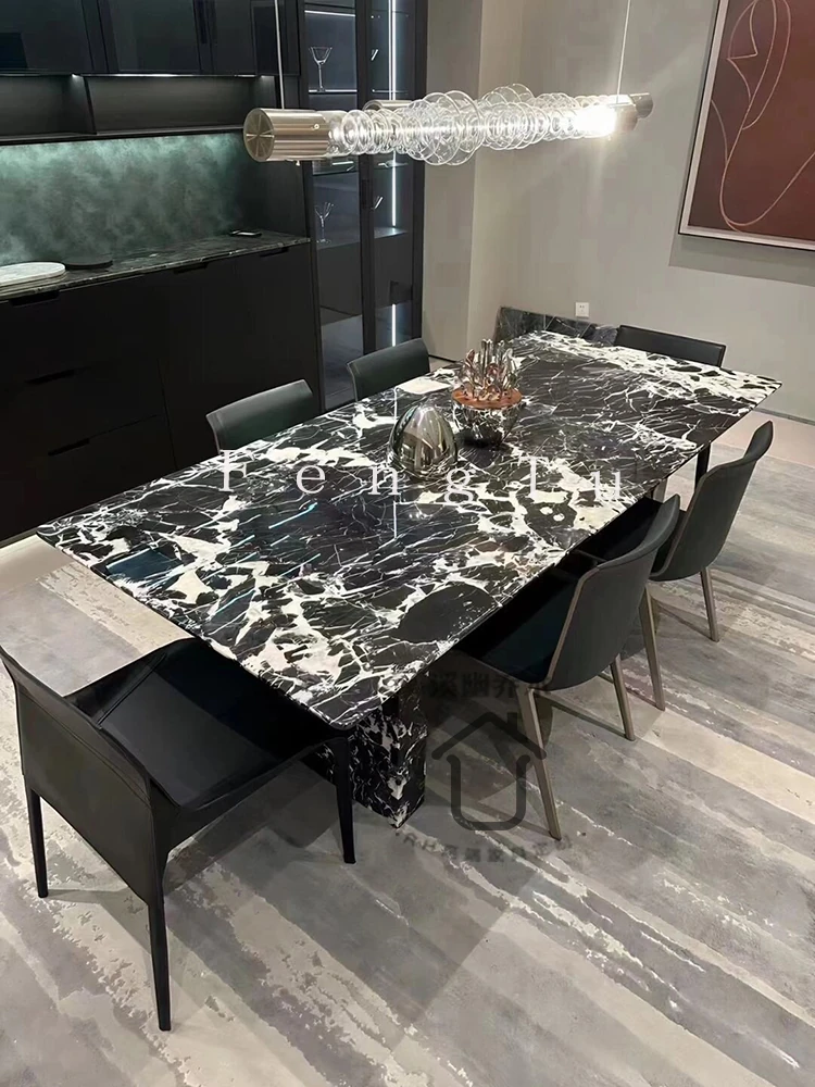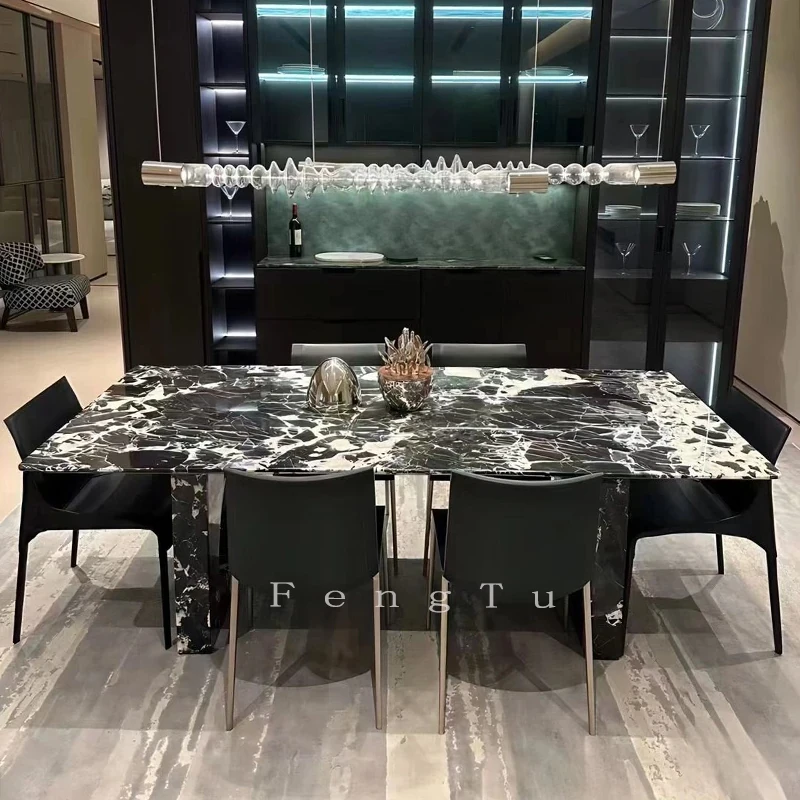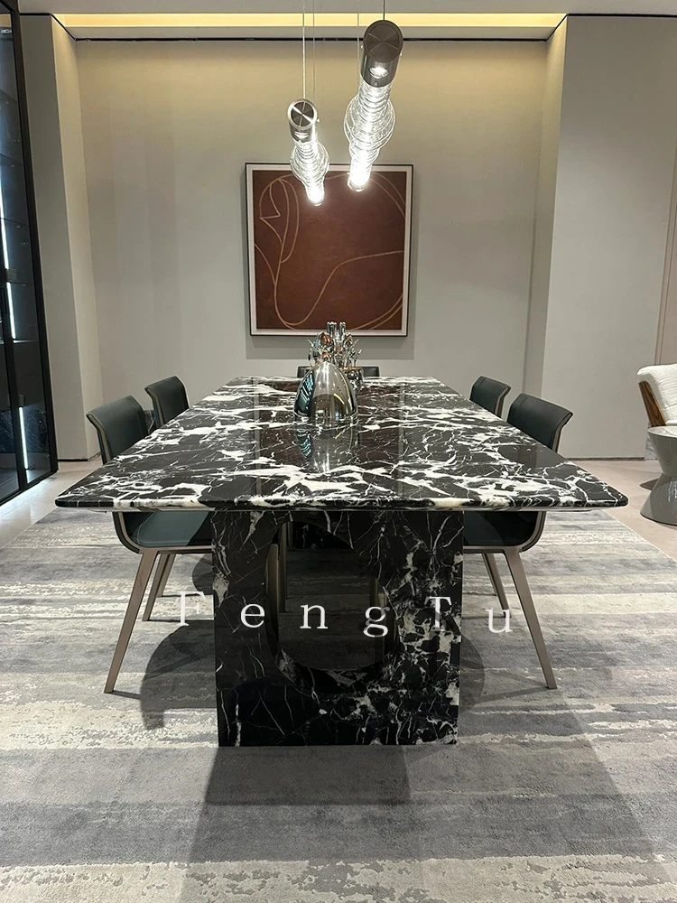 イタリアンミニマルデザインの天然大理石ダイニングテーブル - 家庭用にぴったり!ボッテガ・ヴェネタ風のラグジュアリーなブラックストーンで、ヴィラに最適な長方形の食卓。優雅さと機能性を兼ね備えた一品です。