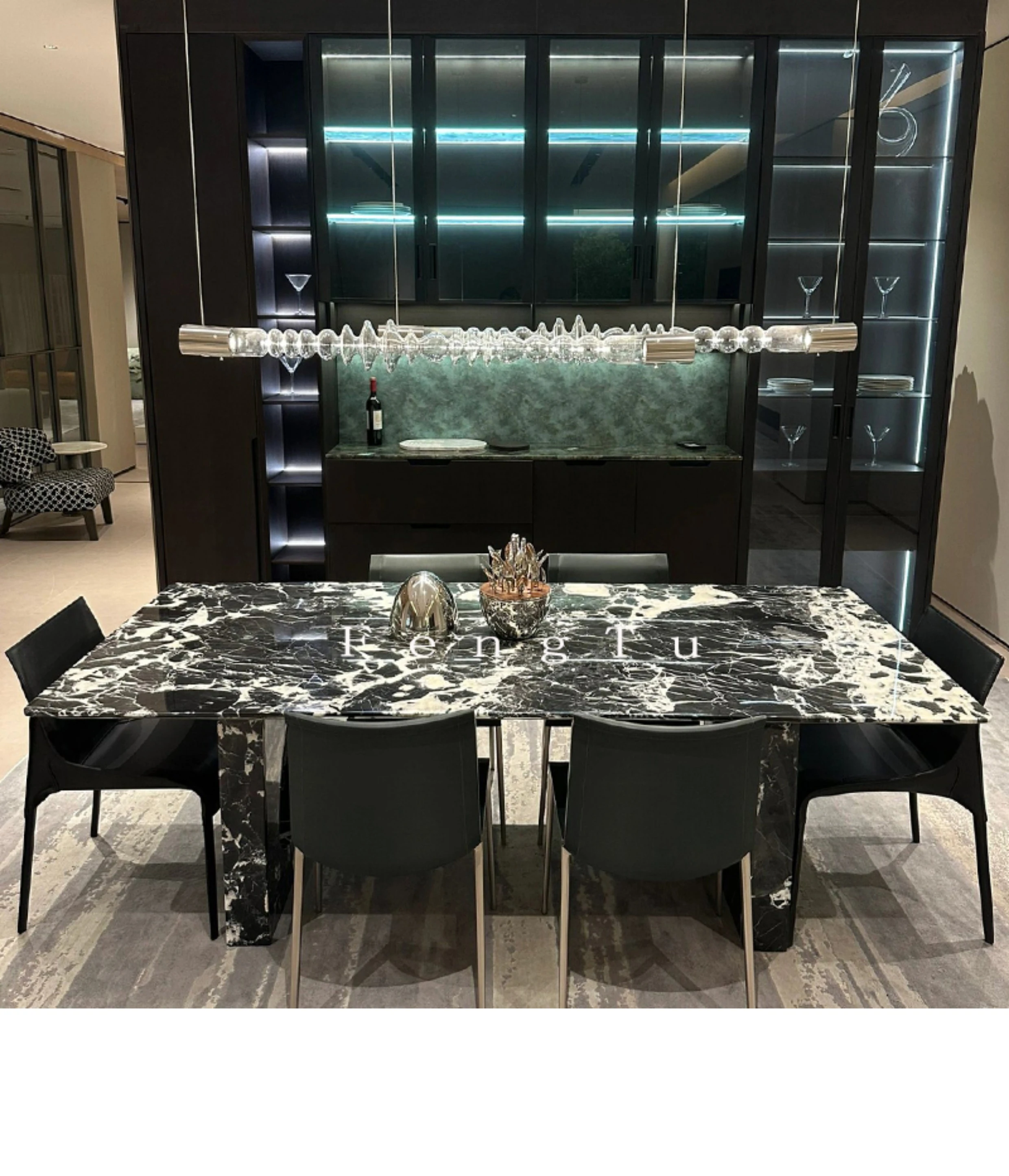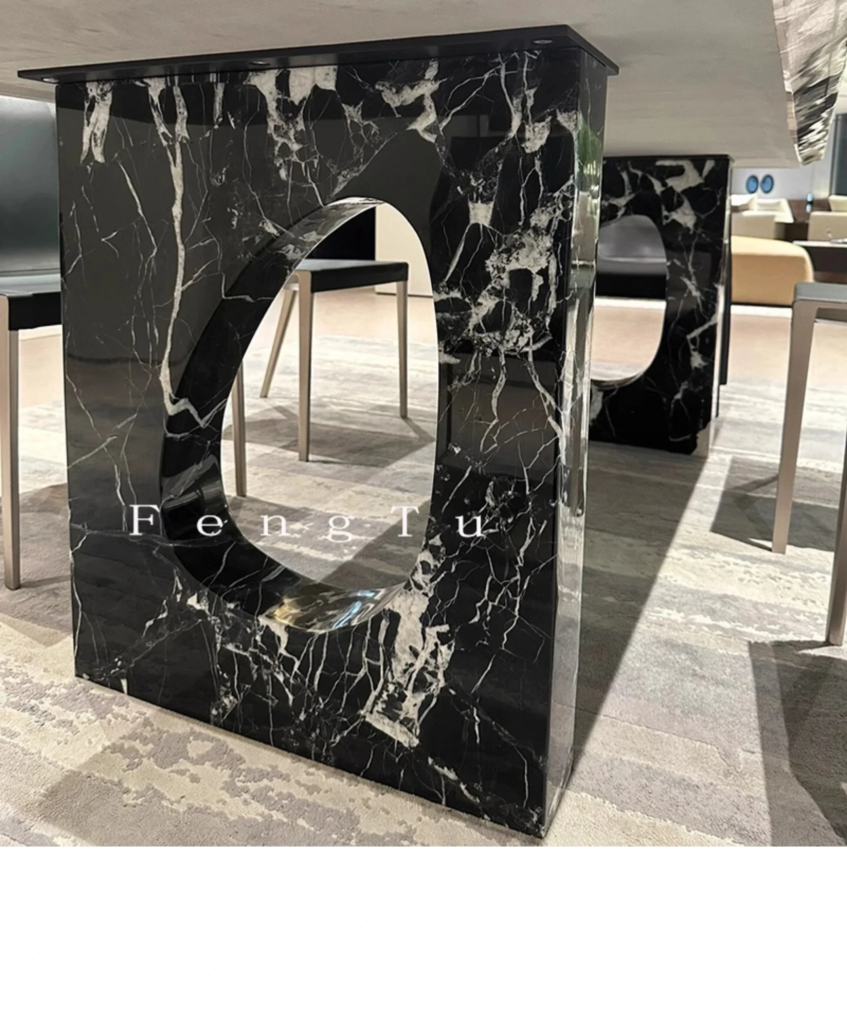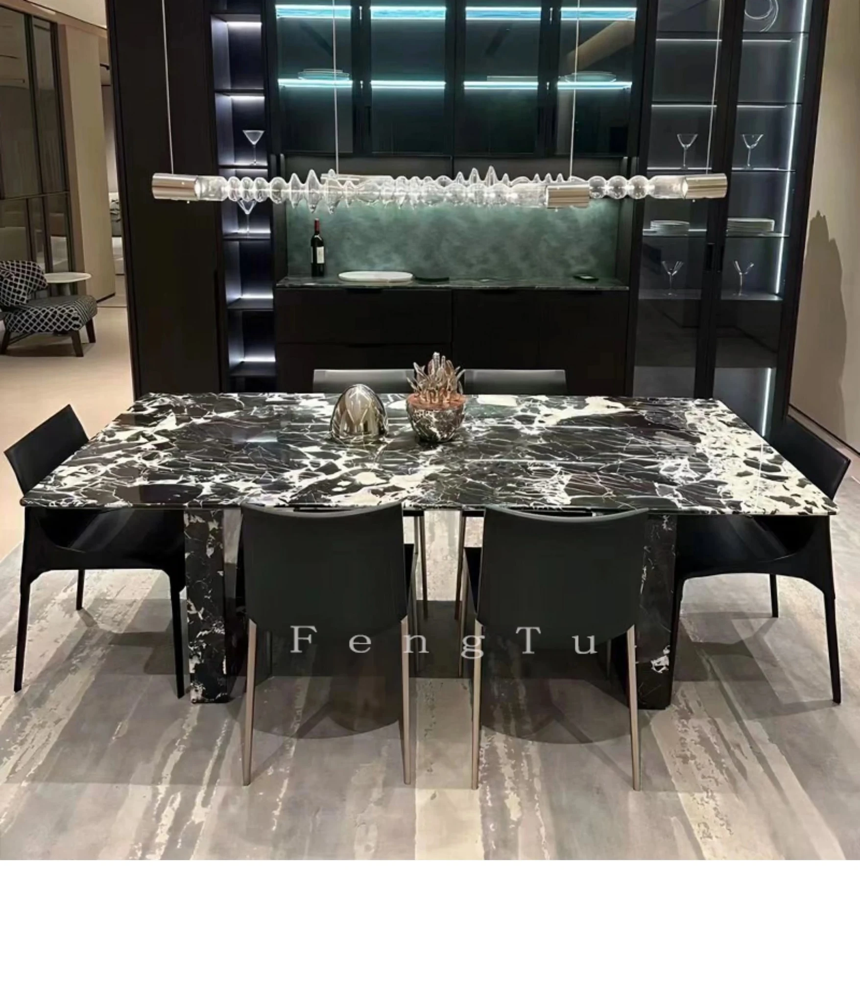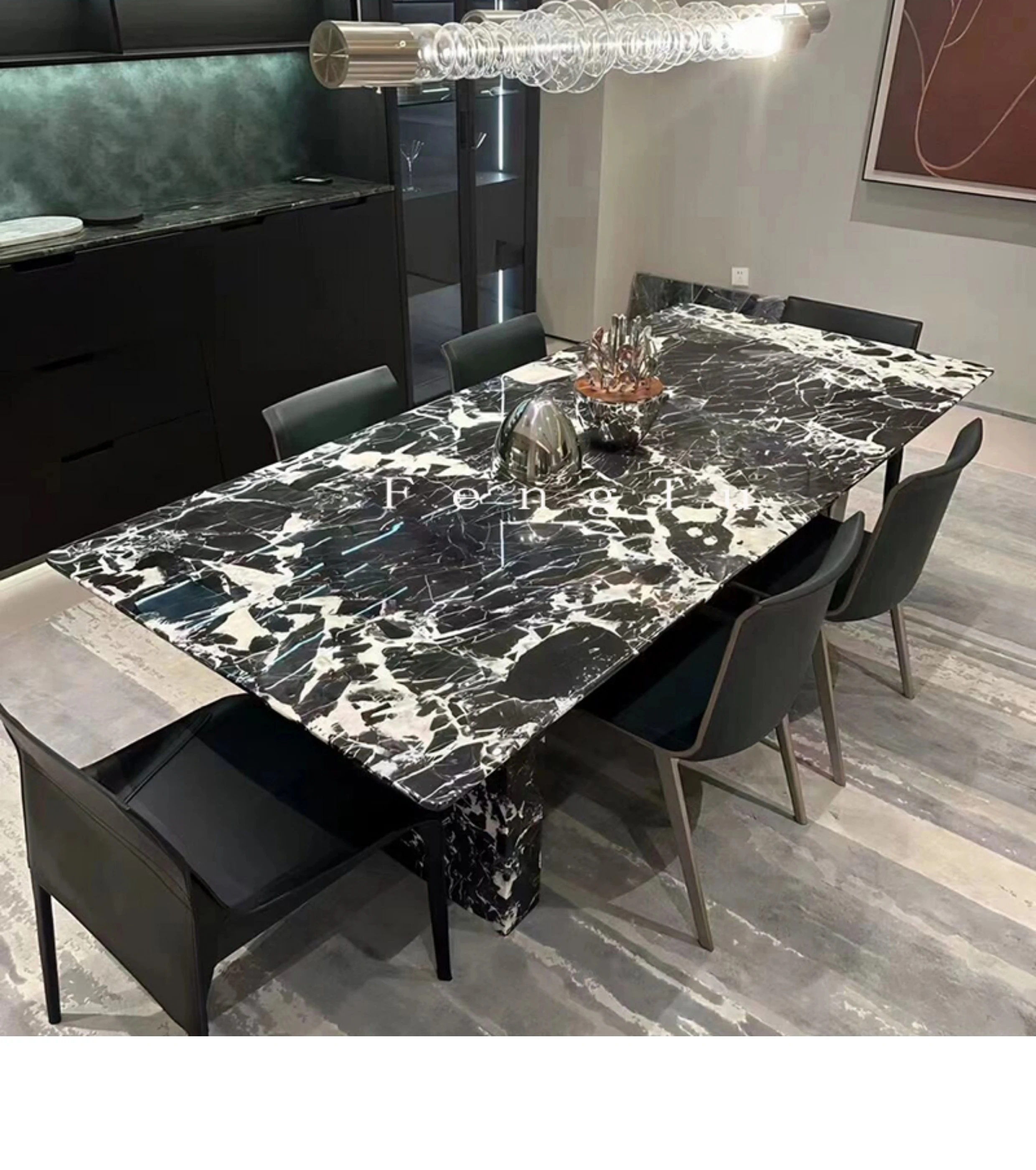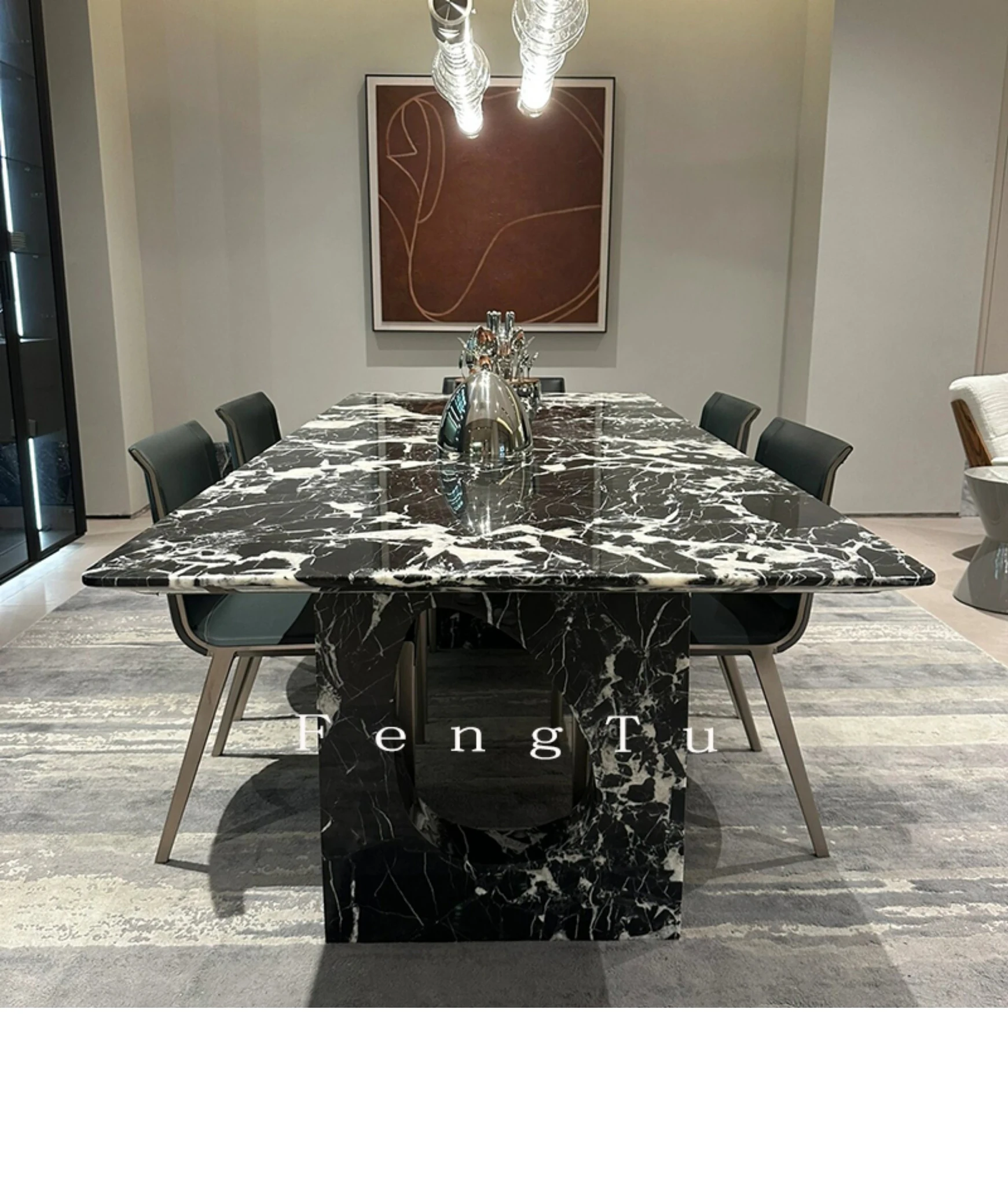 イタリアンミニマルデザインの天然大理石ダイニングテーブル - 家庭用にぴったり!ボッテガ・ヴェネタ風のラグジュアリーなブラックストーンで、ヴィラに最適な長方形の食卓。優雅さと機能性を兼ね備えた一品です。