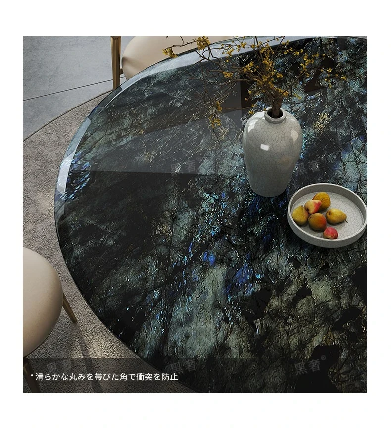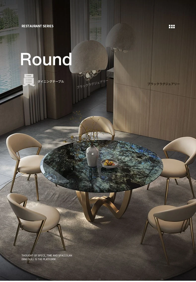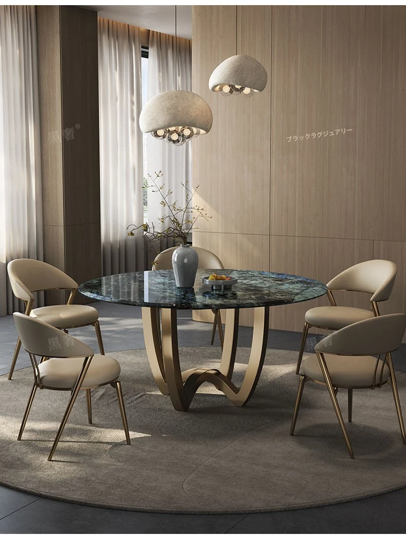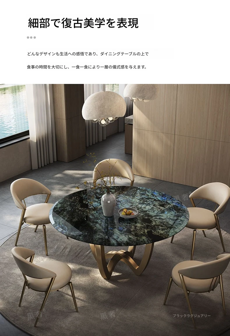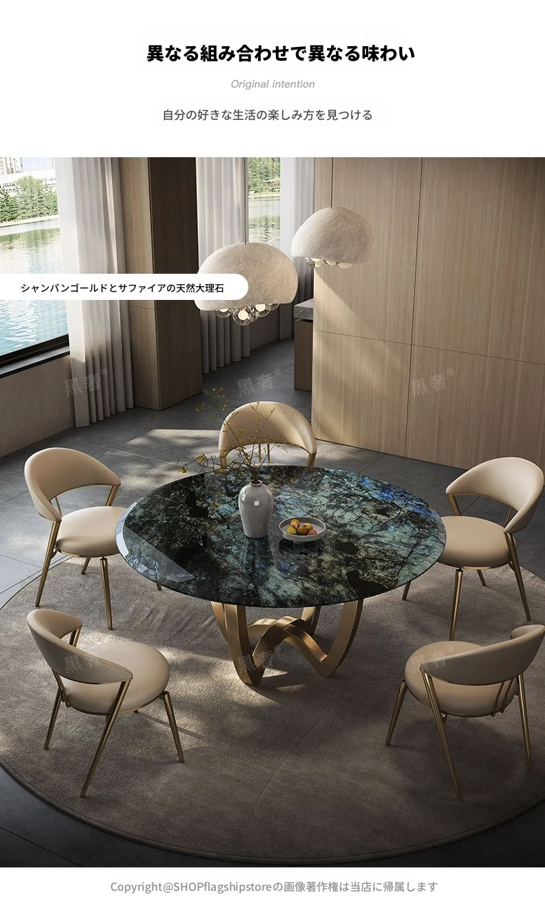 ラグジュアリー感あふれる大理石のラウンドダイニングテーブル|天然のサファイアを使用したイタリアンモダンスタイルの別荘向けテーブル&チェアセット
