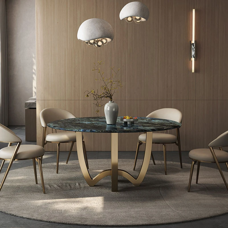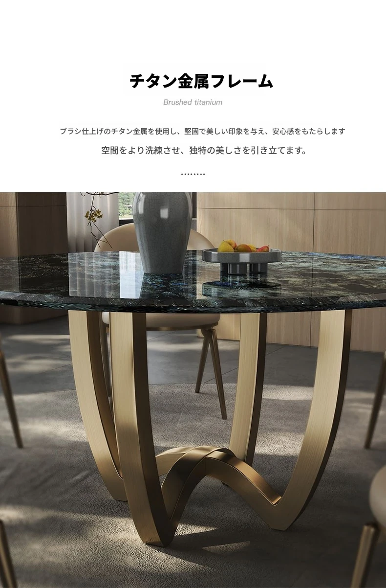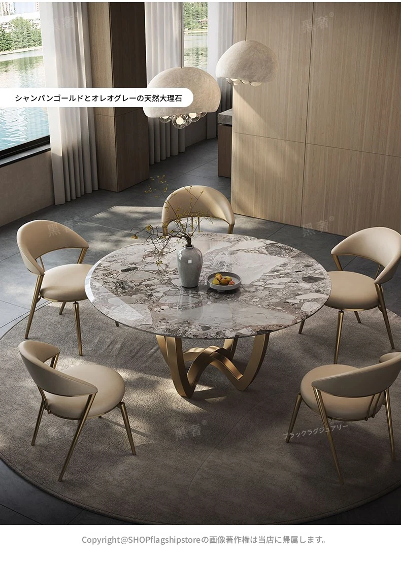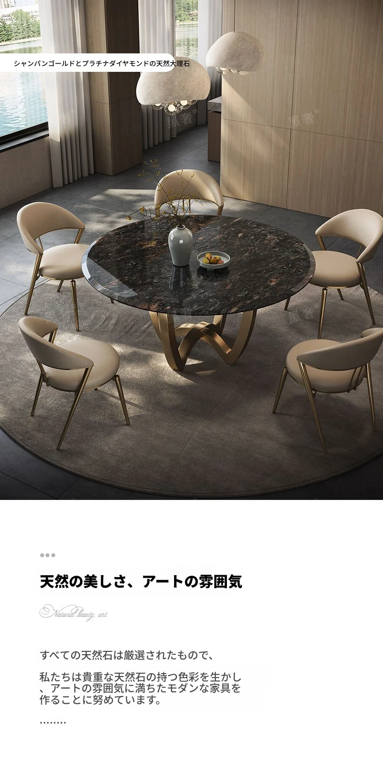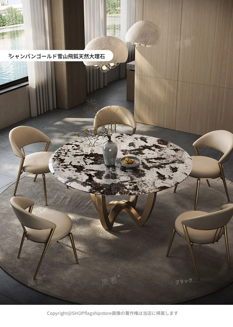 ラグジュアリー感あふれる大理石のラウンドダイニングテーブル|天然のサファイアを使用したイタリアンモダンスタイルの別荘向けテーブル&チェアセット