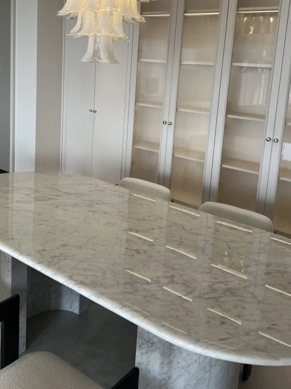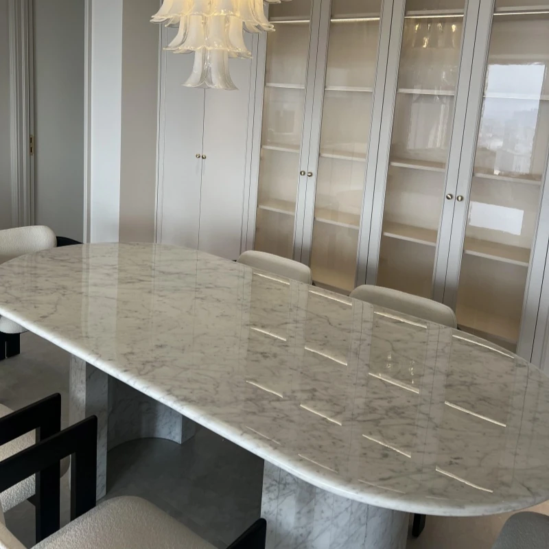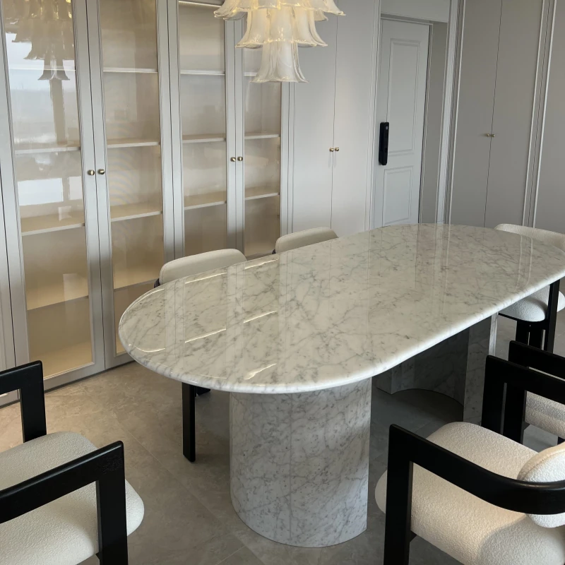 天然大理石エレガントオーバルダイニングテーブル - 現代イタリアンデザイン、北欧スタイル、洗練された中花白の贅沢な石材使用!食卓に上質な美しさをプラスし、特別なひとときを演出します。