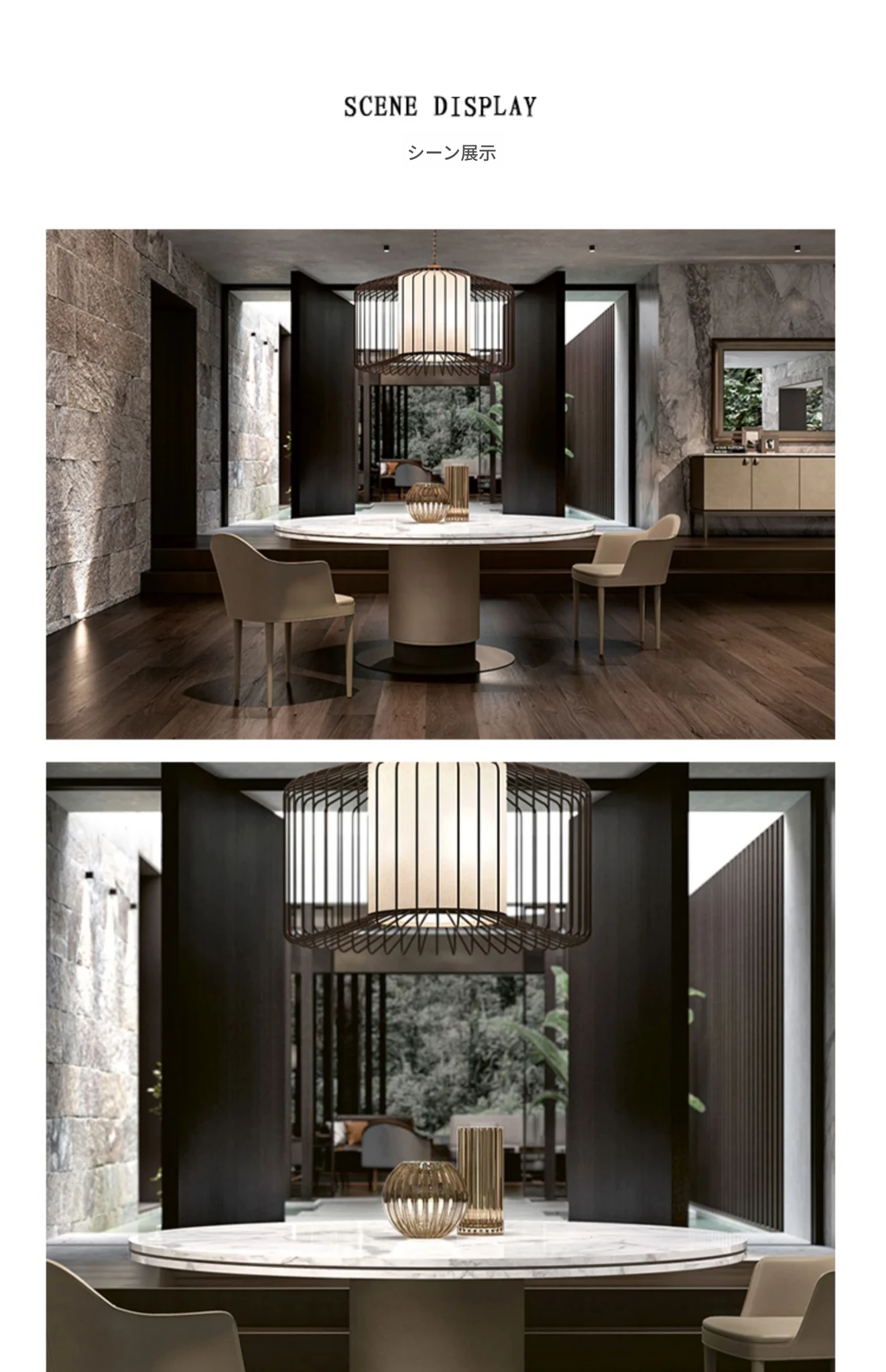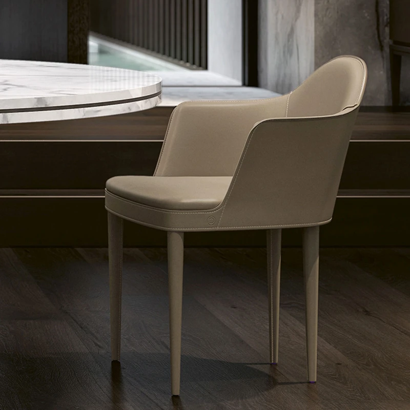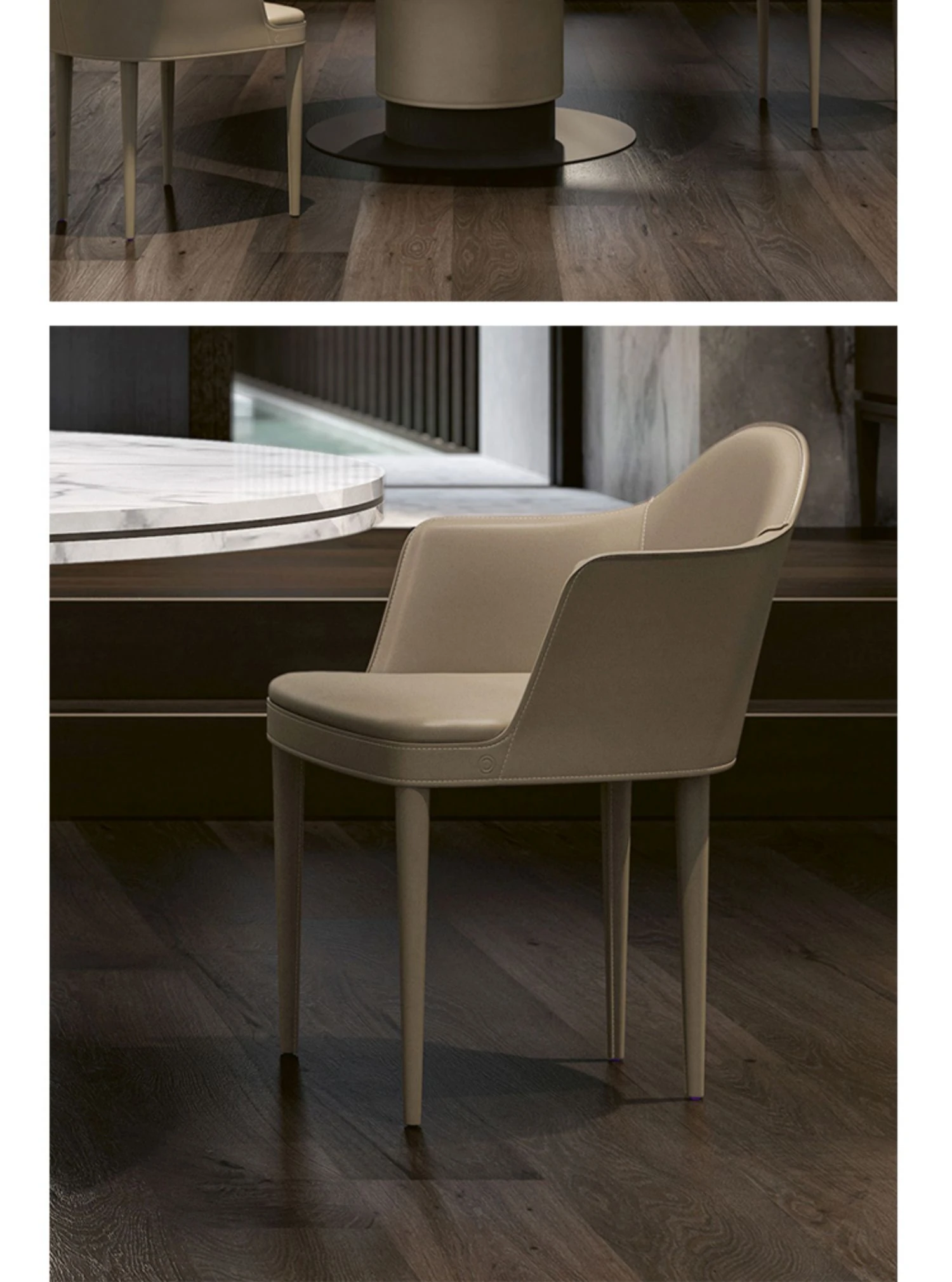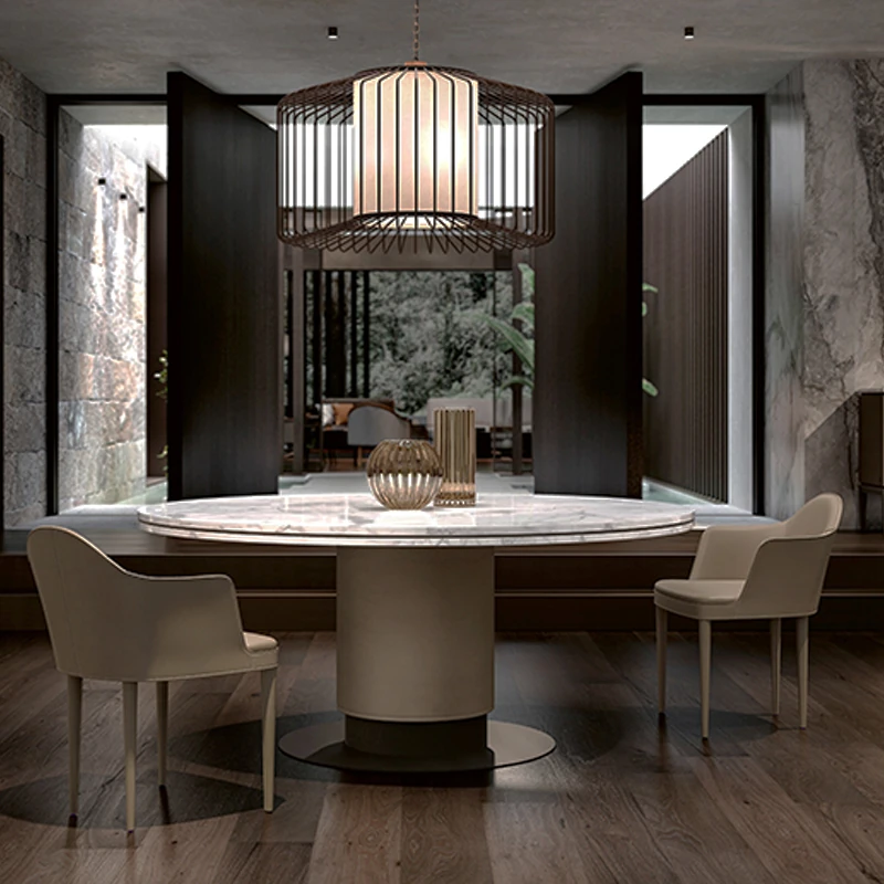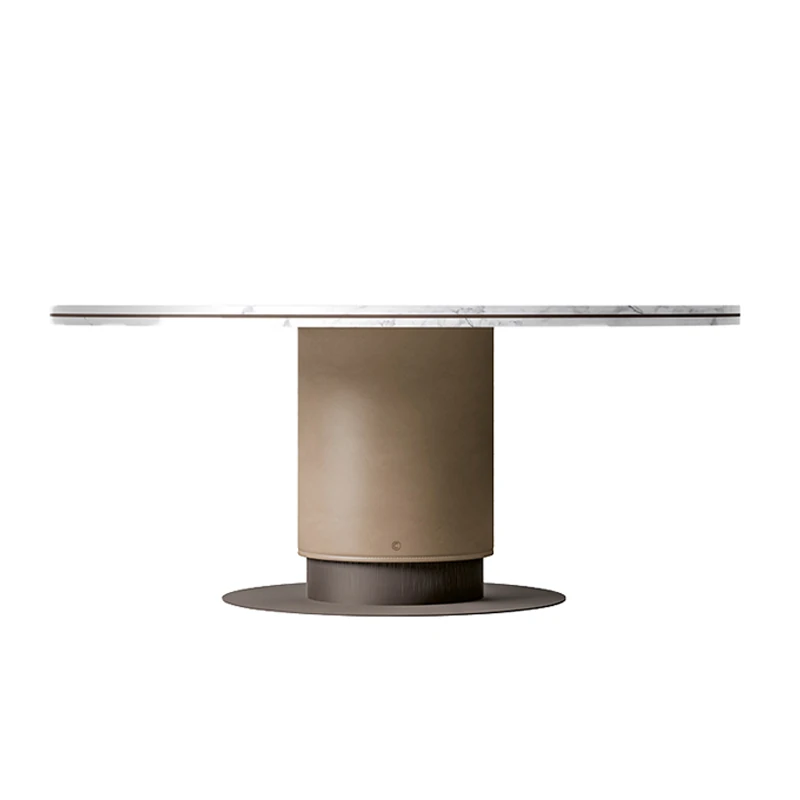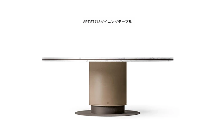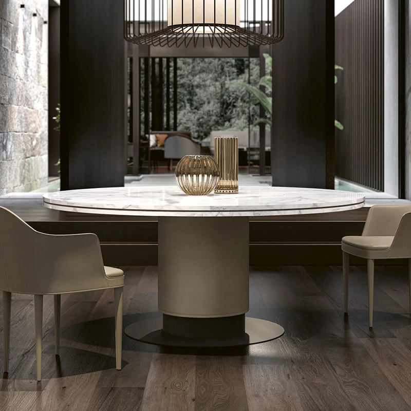 イタリアの高級デザイナーによるラグジュアリーなダイニングテーブル&チェアセット - ミニマリストな贅沢感を演出するレザーと大理石の丸テーブルで、別荘やレストランに最適!