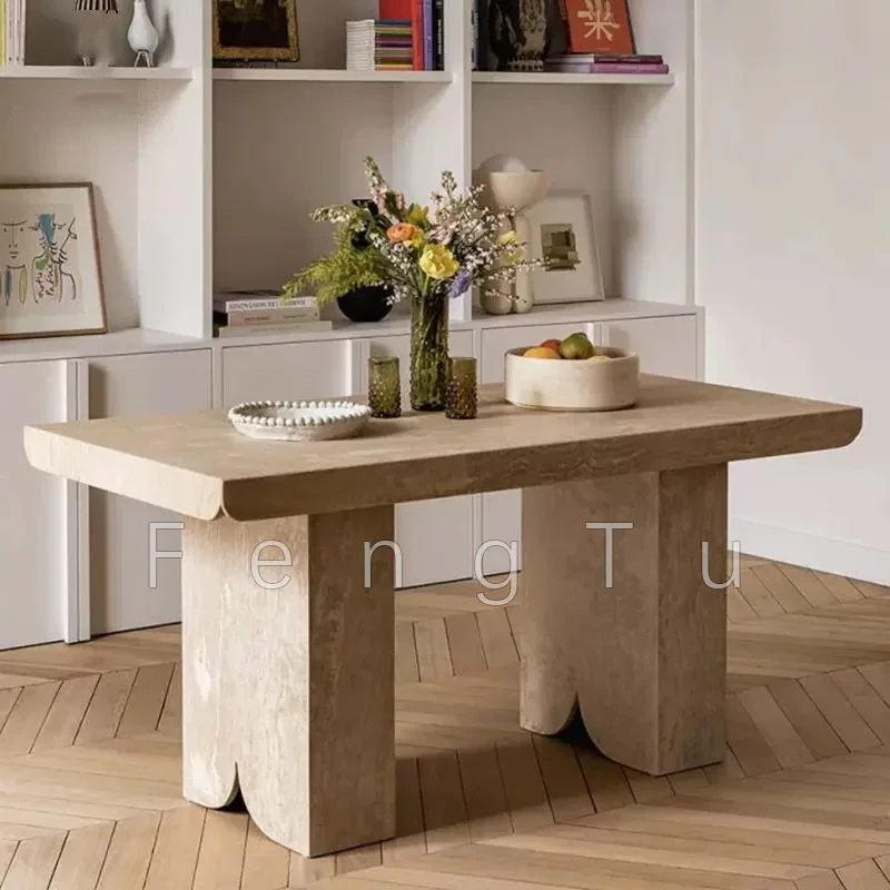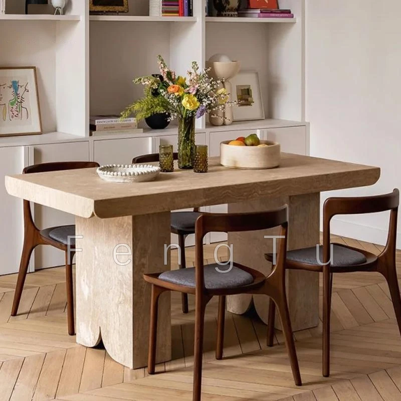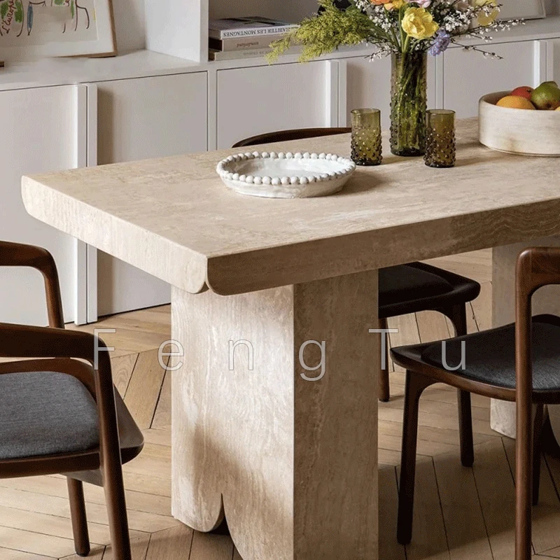 イタリアンミニマル天然大理石ダイニングテーブル - 洞石デザイン、小型リビングに最適!高級感溢れる長方形の食卓で、軽やかな贅沢をお楽しみください。
