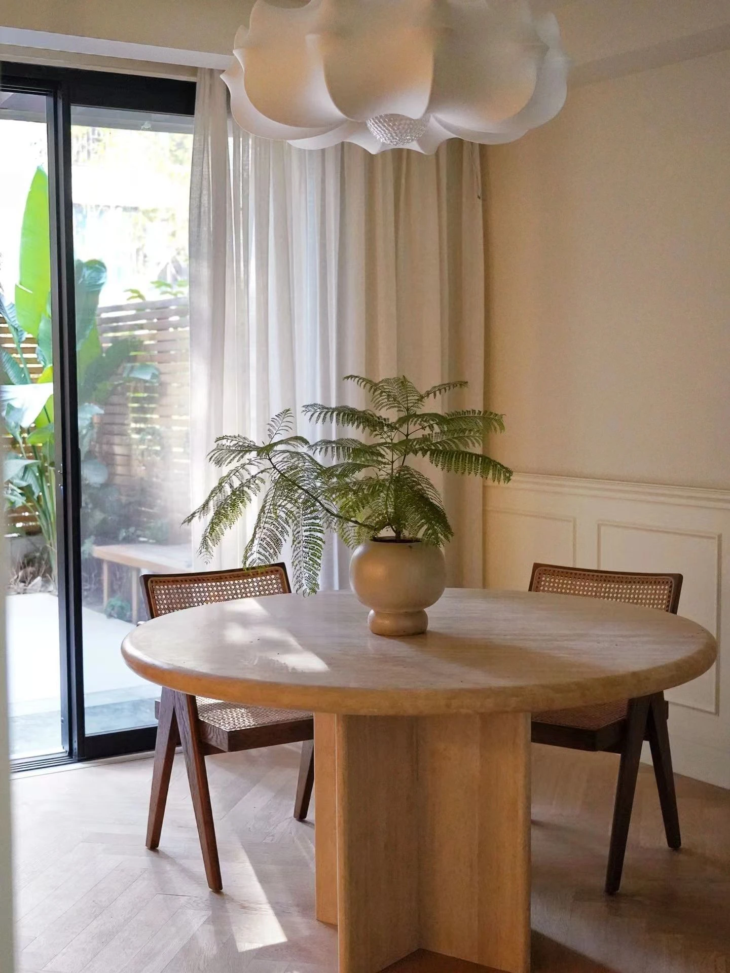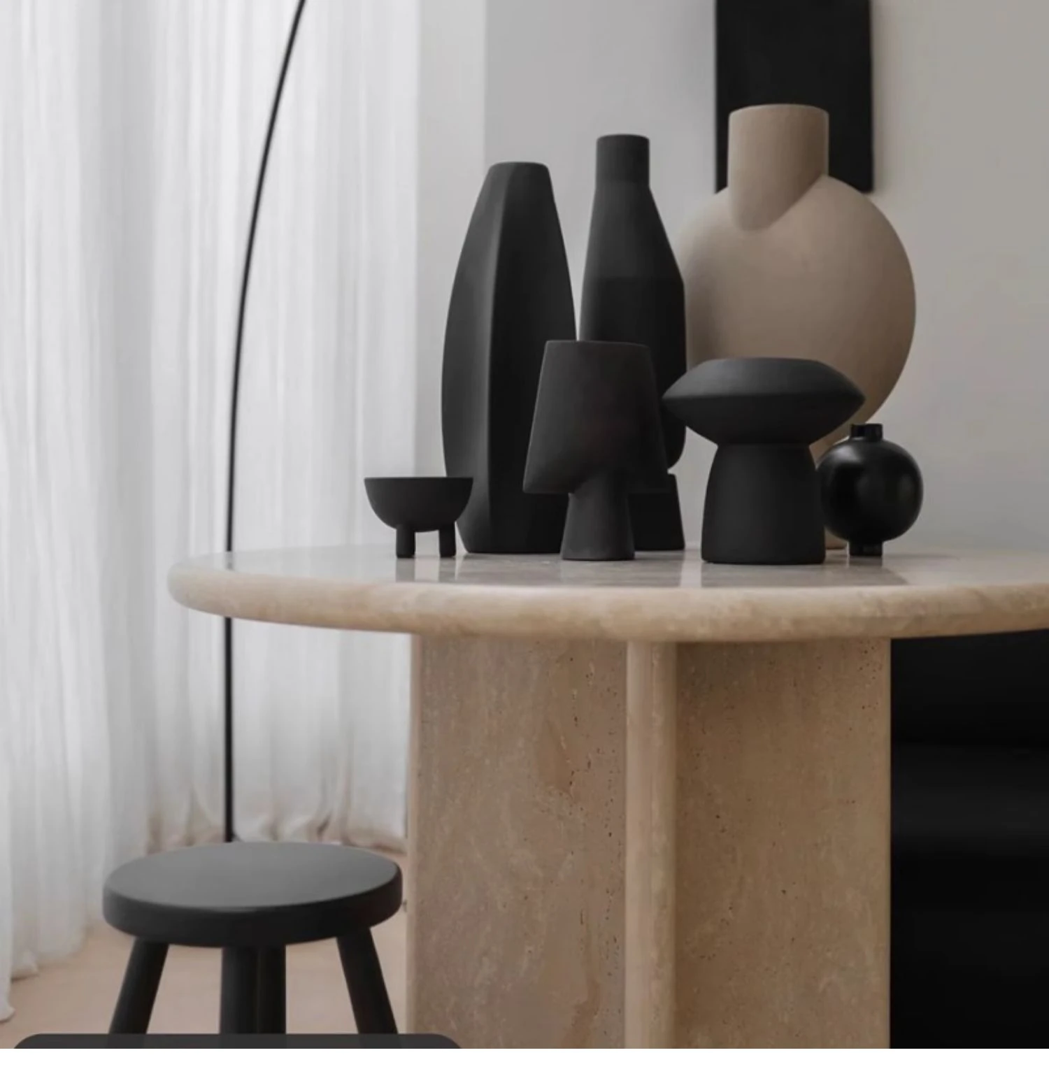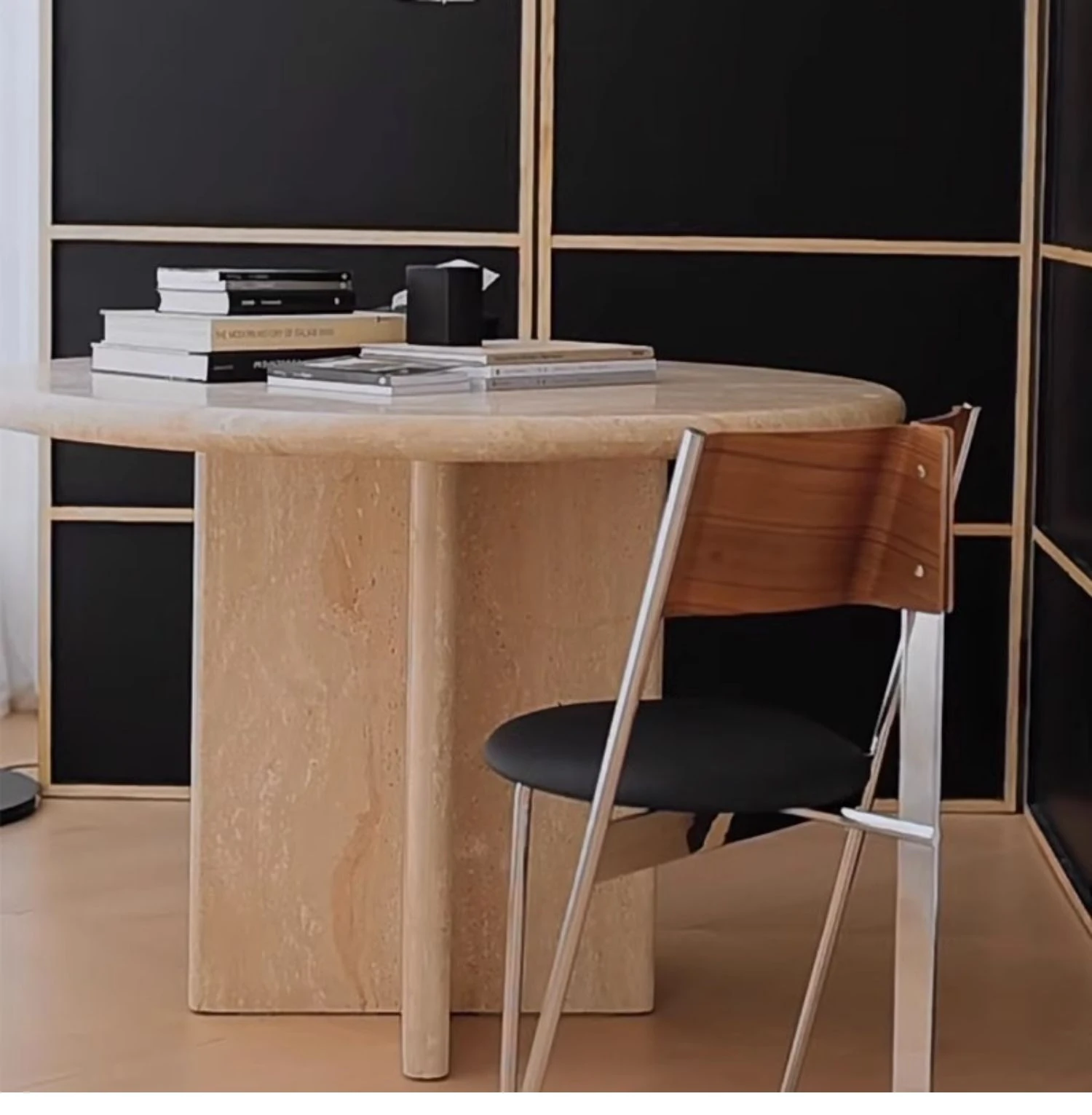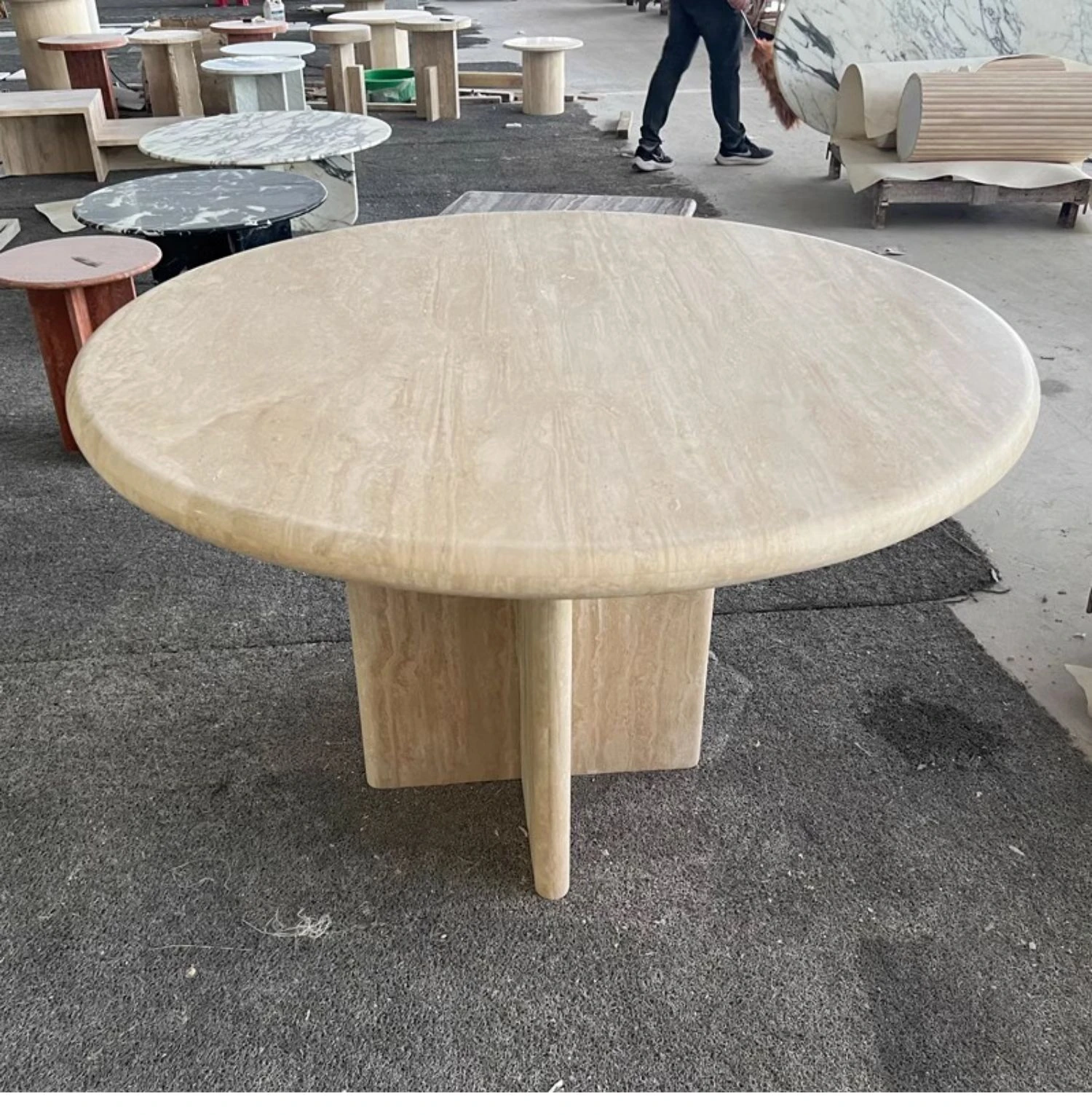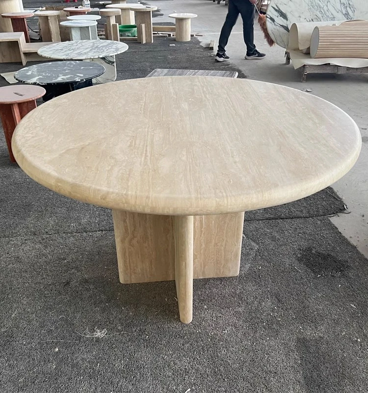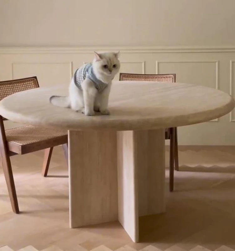 イタリアンデザインの天然洞石製ダイニングテーブル - 高級感溢れるカフェスタイル、クリーミーな侘寂の美しさを持つラウンドテーブル。あなたの空間を格上げする一品です!