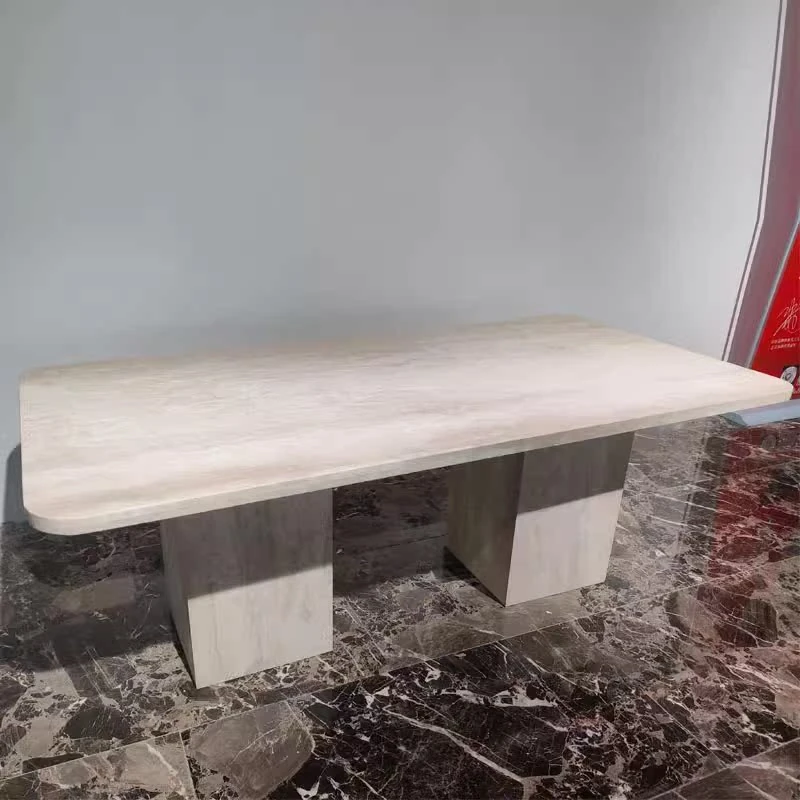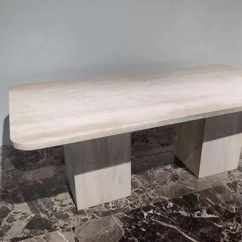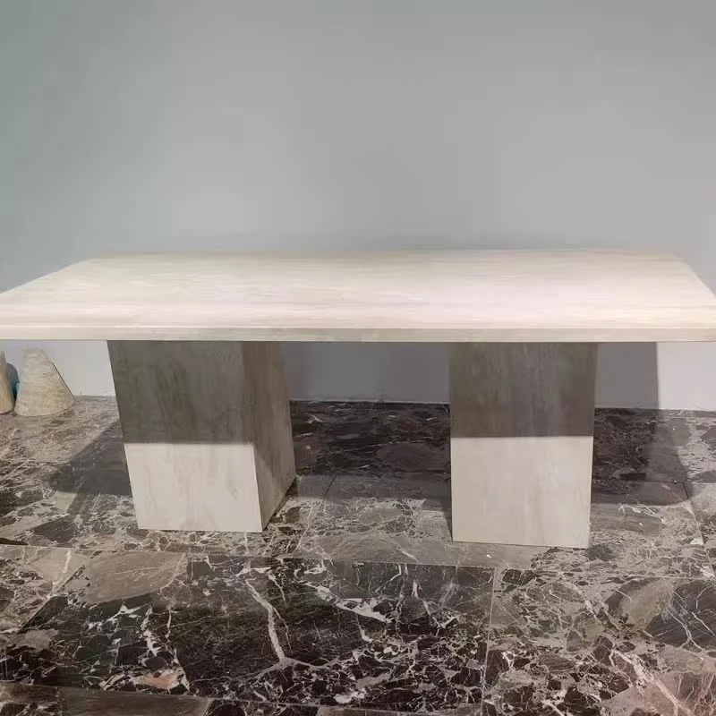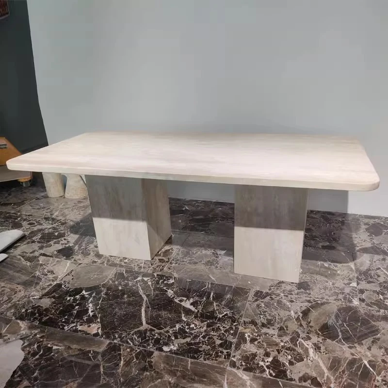 天然洞石のダイニングテーブル - イタリアンミニマリズムの魅力!ヴィラやホテルにぴったりなシンプルでスタイリッシュなデザイン。インフルエンサーも絶賛のロングテーブルで、理想の食卓を演出します。