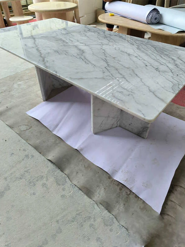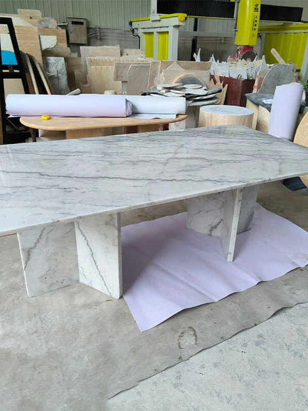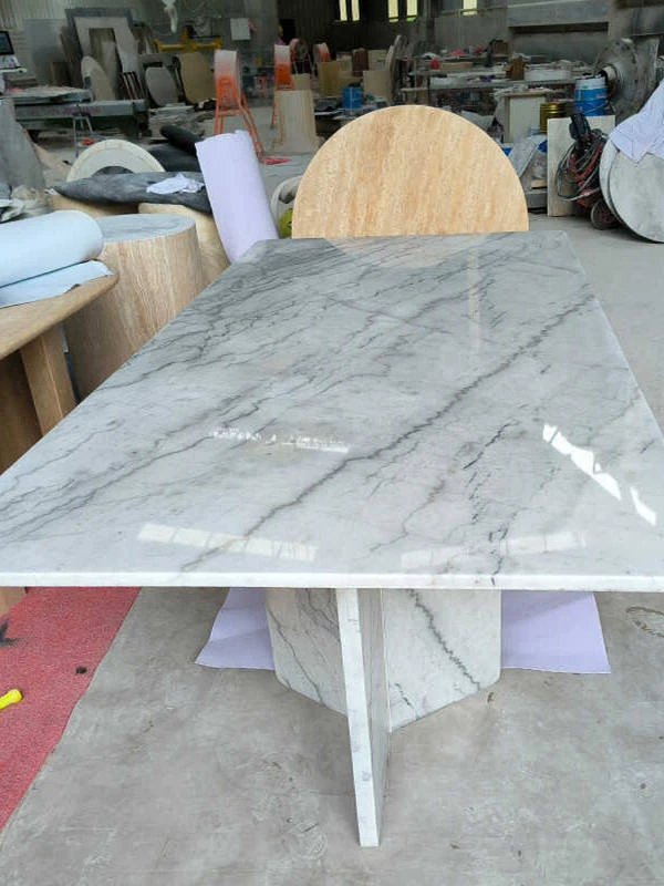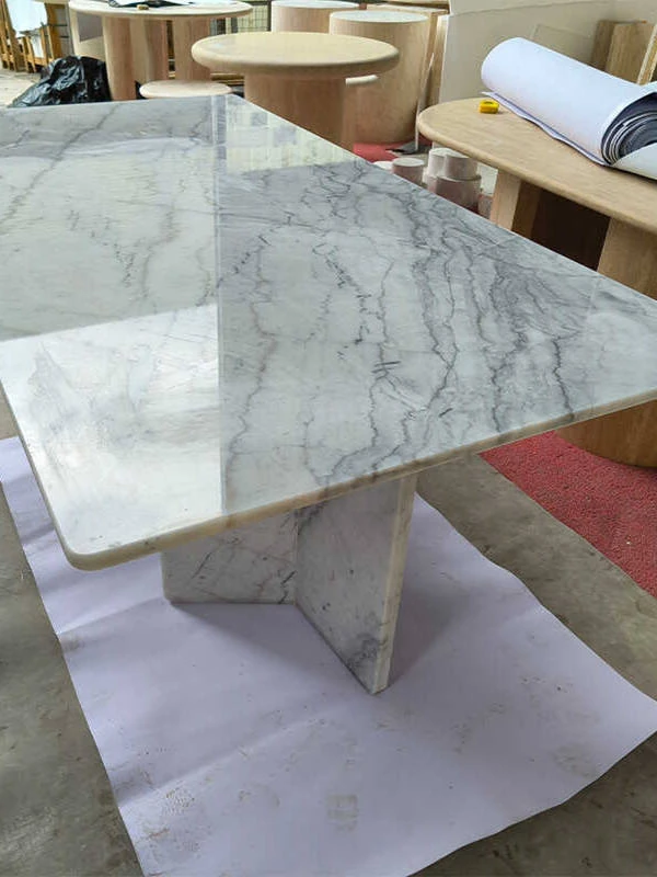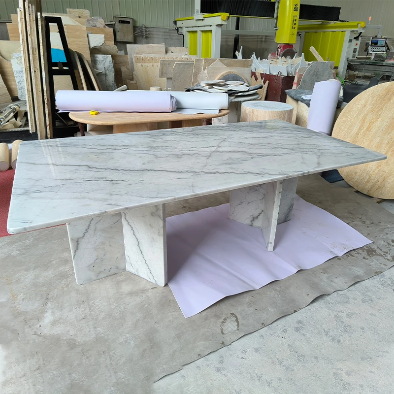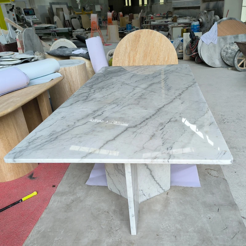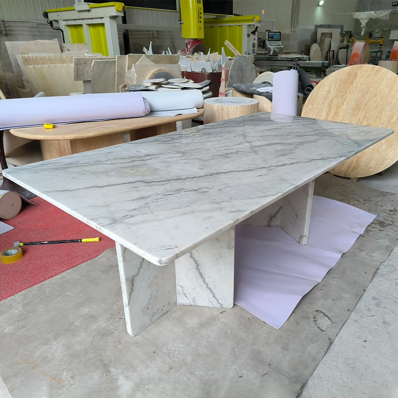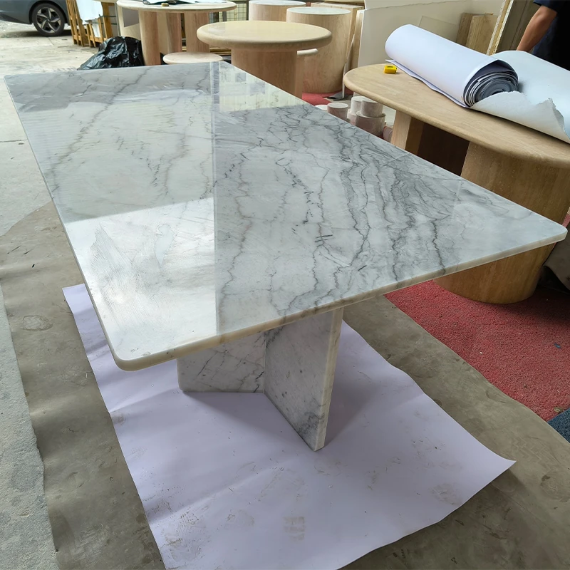 北欧スタイルの天然大理石スノーフレークホワイト高級フレンチクリーム長方形ダイニングテーブル - デザイナーズエディション、洗練されたデザインでお部屋を格上げ。