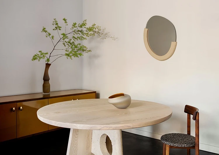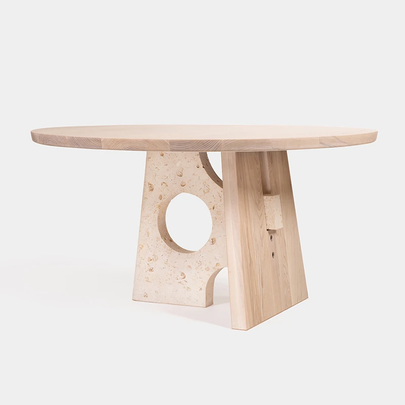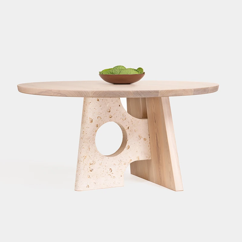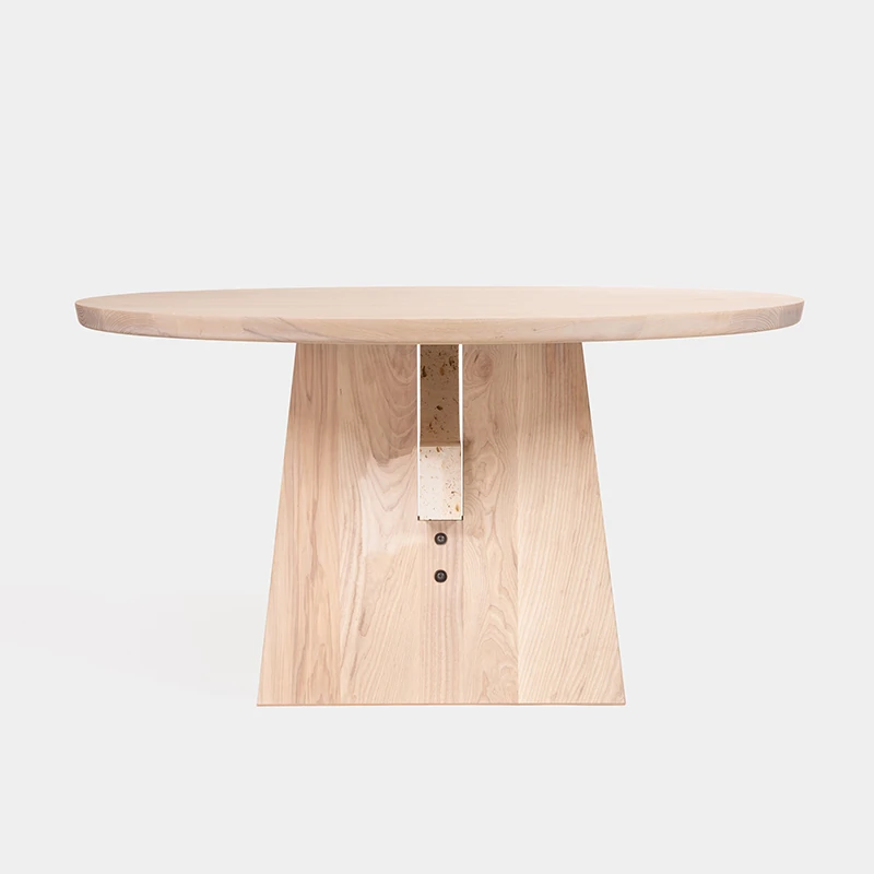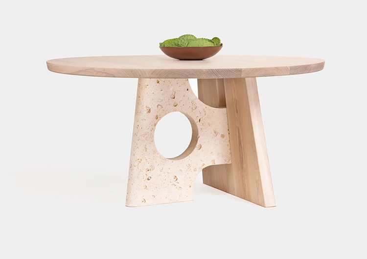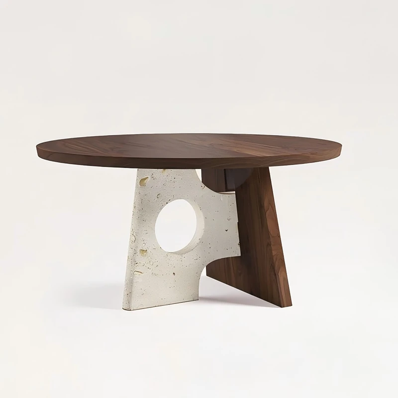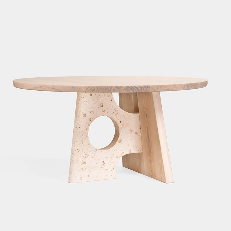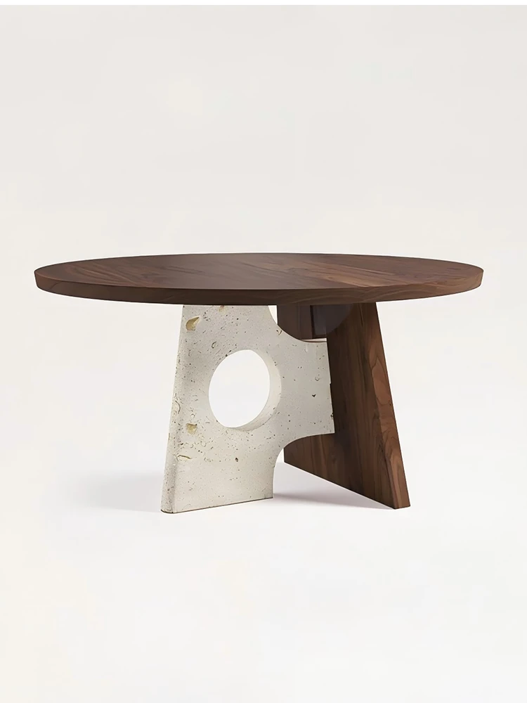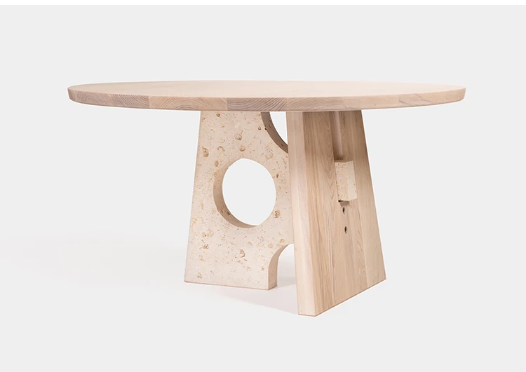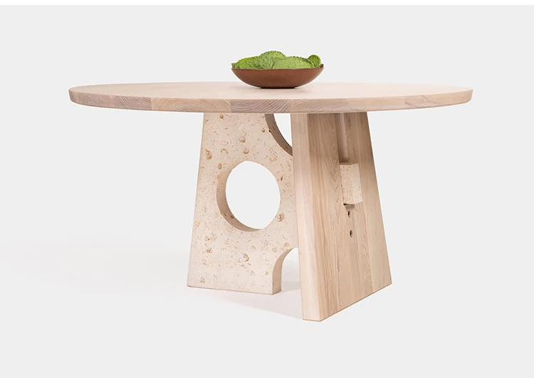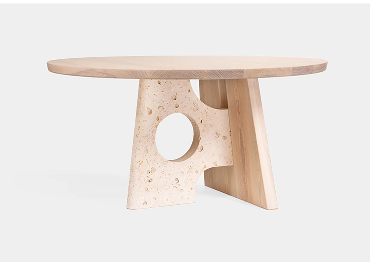 中古風の無垢材洞石円形ダイニングテーブル - 侘寂スタイルの高級感溢れるデザイン。豪邸や別荘にぴったりのクリエイティブな家具。おしゃれな空間を演出し、特別なひとときをお楽しみください。