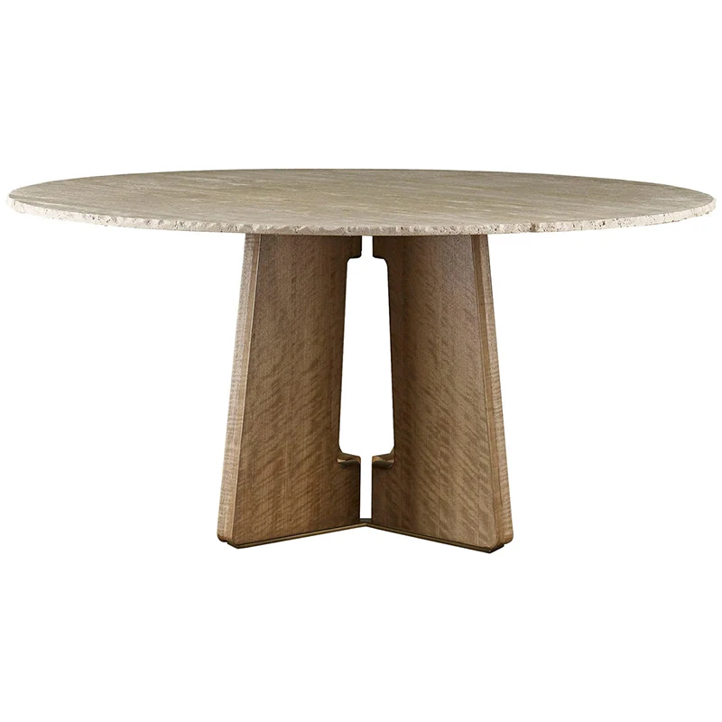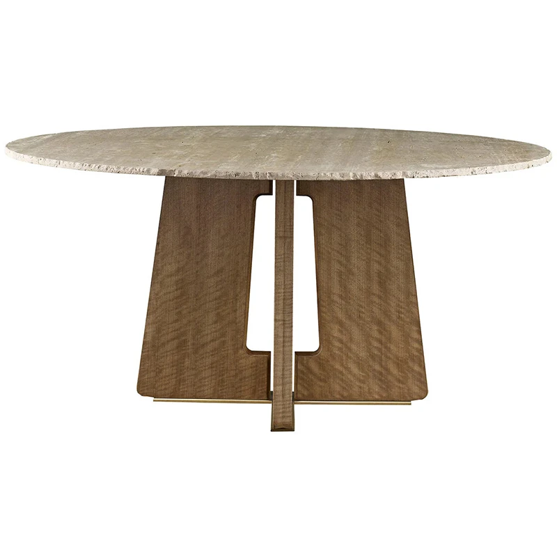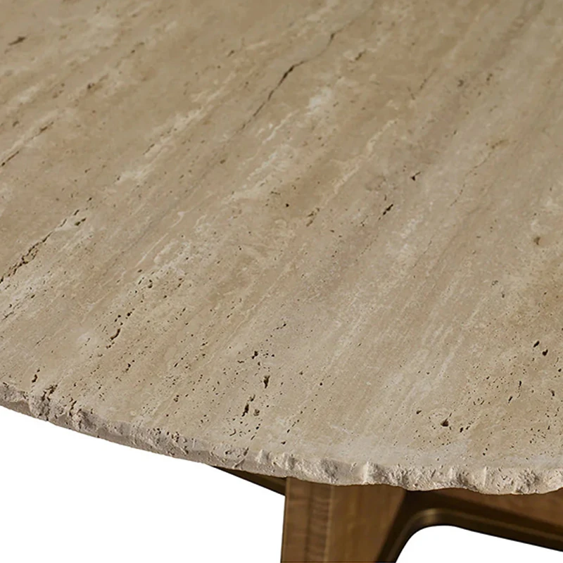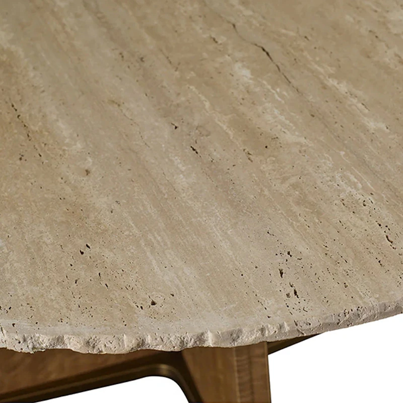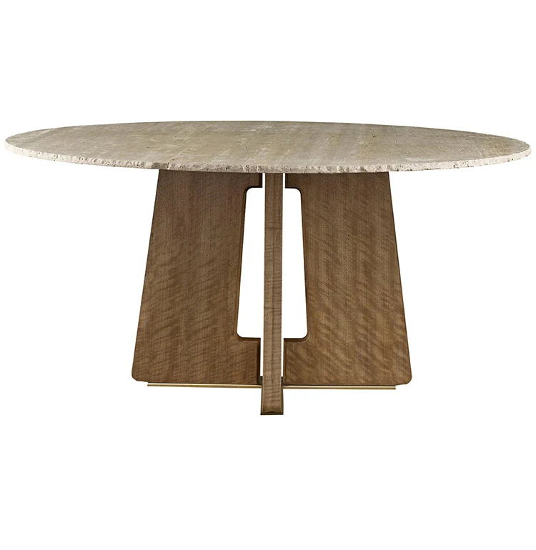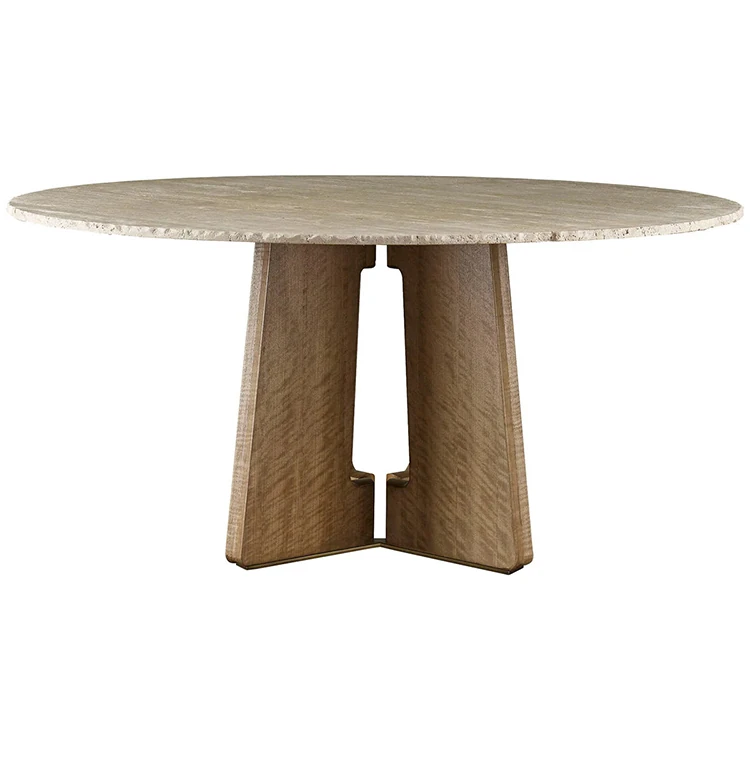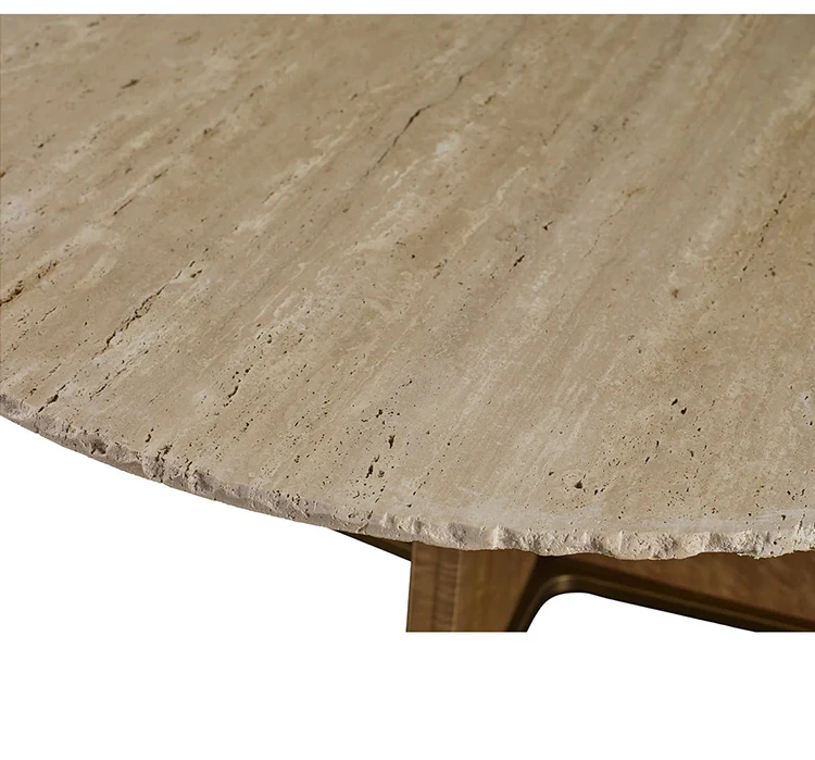 侘寂風デザインの天然洞石ダイニングテーブル - ラグジュアリーでありながら家庭的な雰囲気を演出する円形アートテーブル。高品質の無垢材使用、食事を特別な時間に変えるクリエイティブな一品。