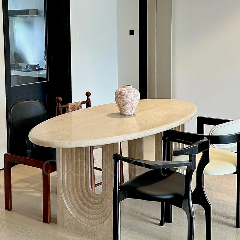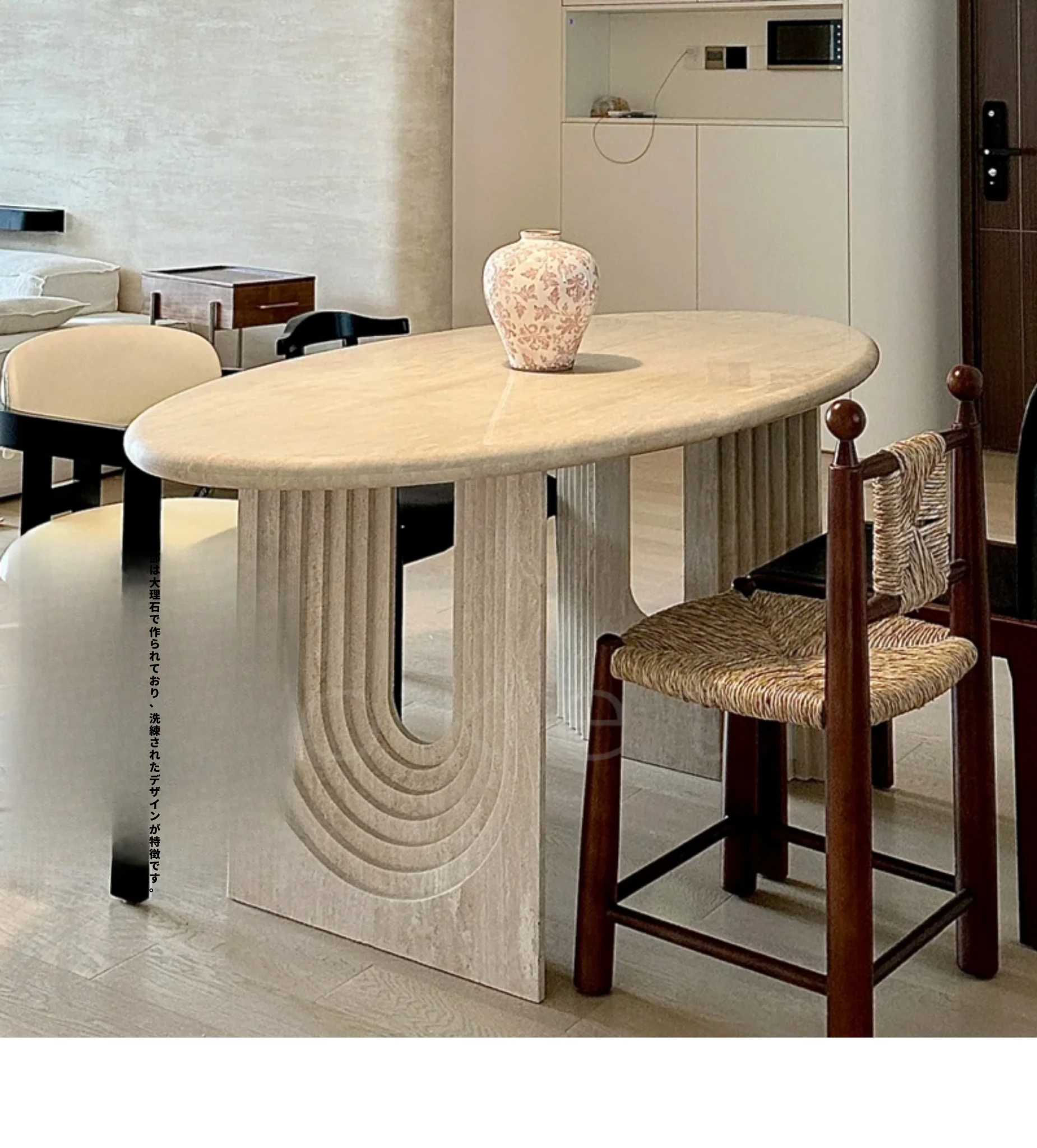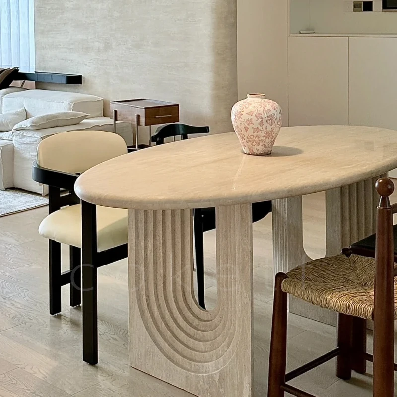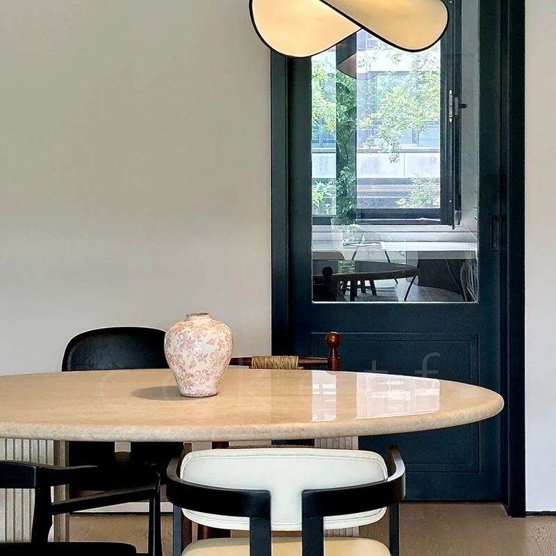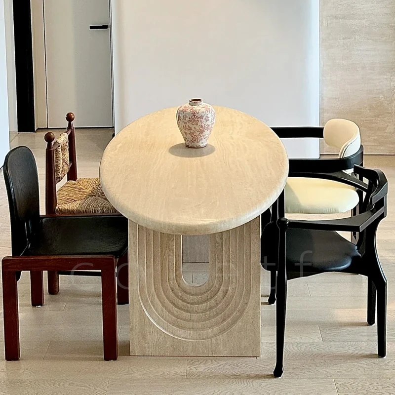 侘寂風の天然オーバルホールストーンダイニングテーブル|小スペースにぴったりのデザイナーズフランス高級感あふれる食卓|美しい食事のひとときを演出します。
