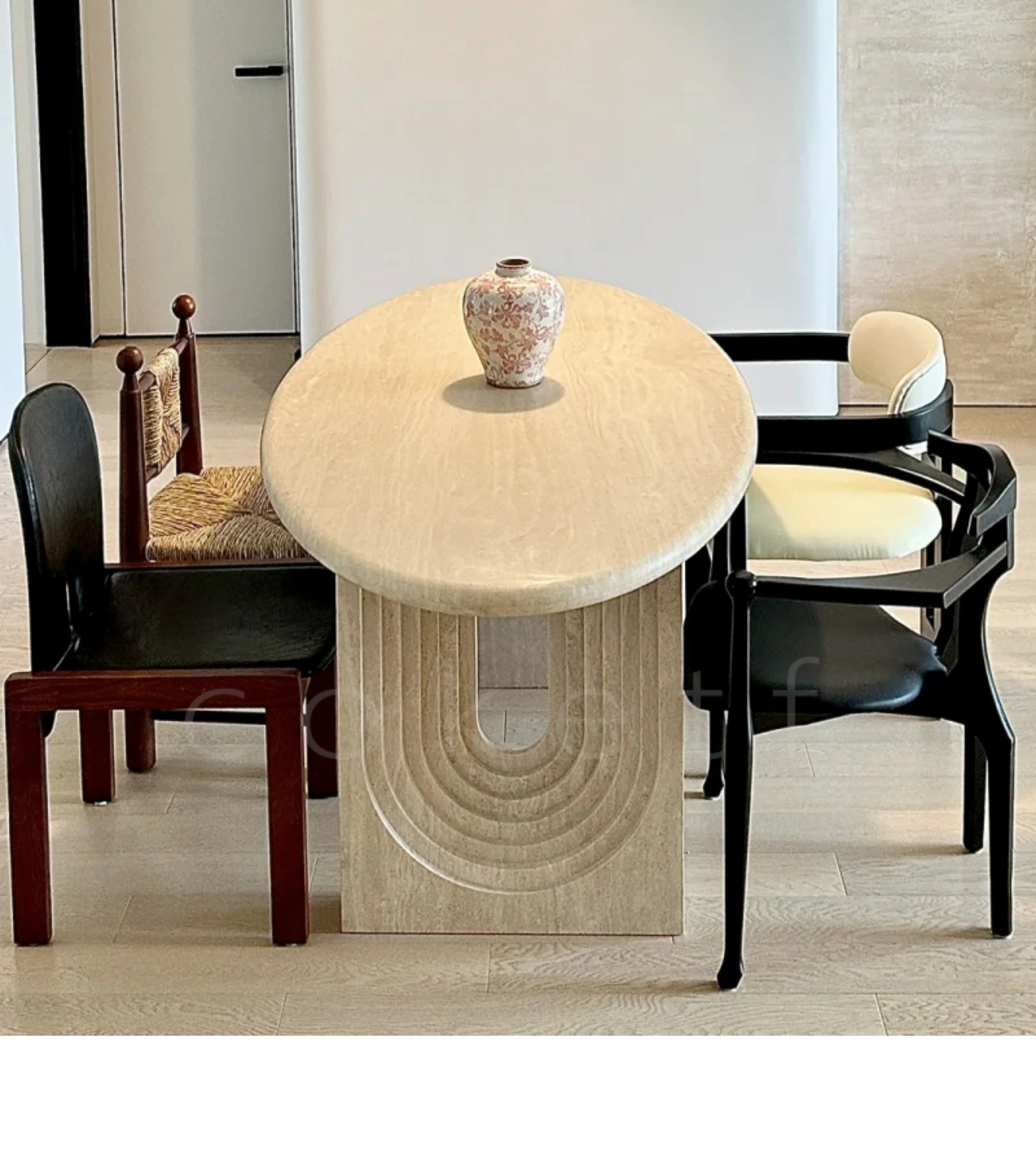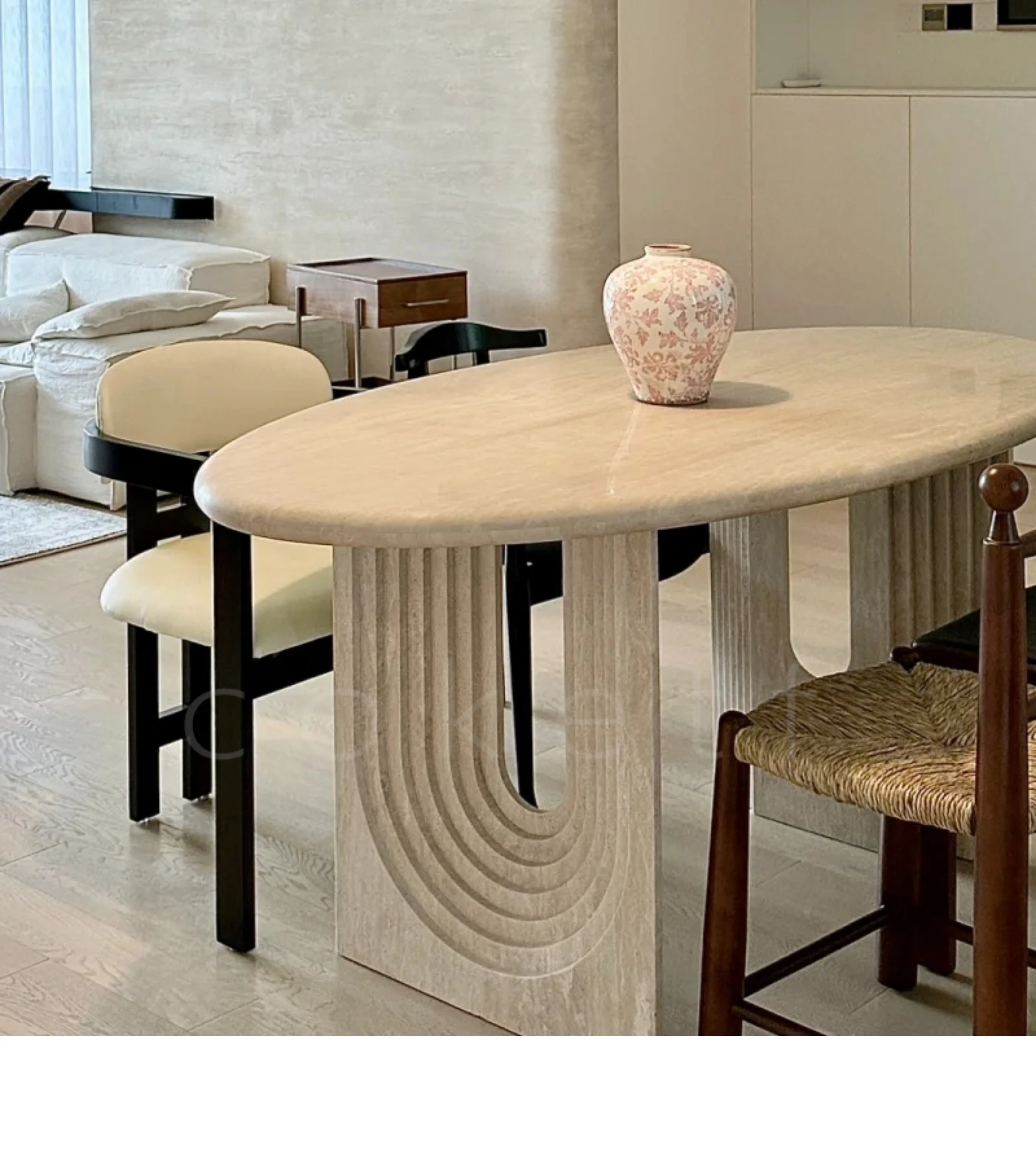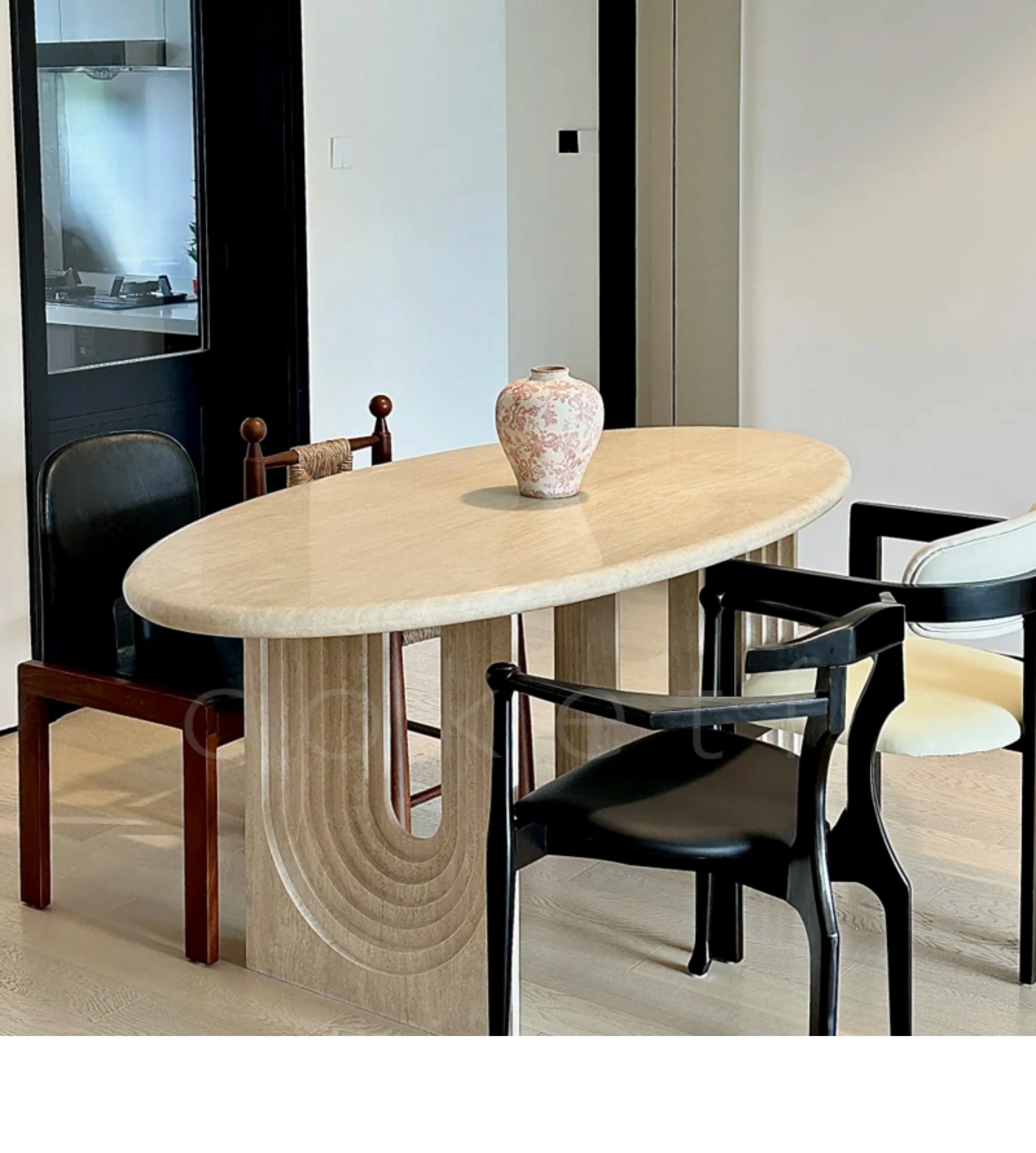 侘寂風の天然オーバルホールストーンダイニングテーブル|小スペースにぴったりのデザイナーズフランス高級感あふれる食卓|美しい食事のひとときを演出します。