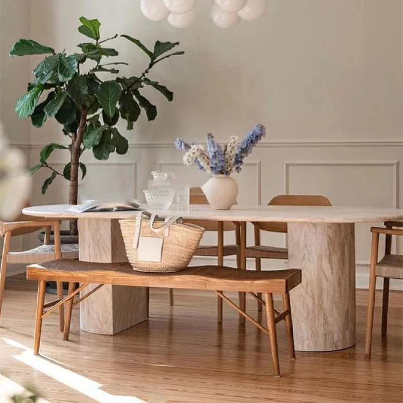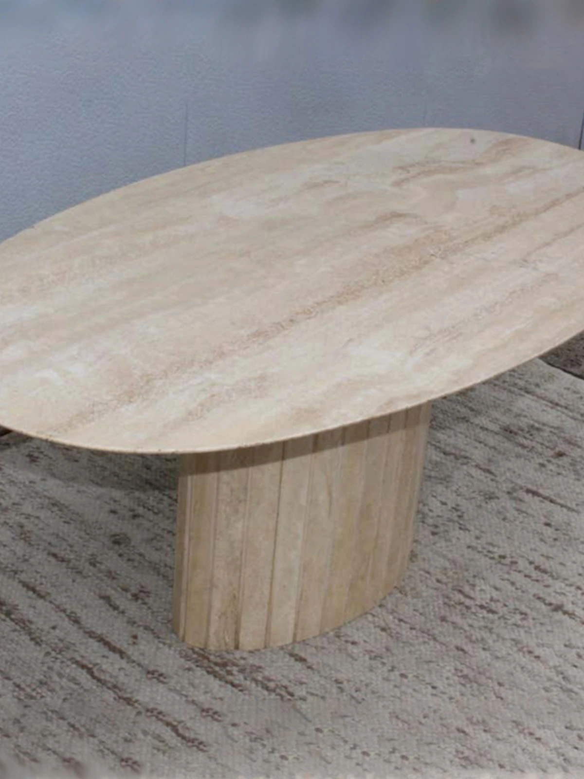 侘寂風のナチュラル洞石テーブル|中古の小型リビングに最適!軽やかなラグジュアリー感を演出する大理石オーバルダイニングテーブル。おしゃれな空間を作り出し、心地よい食事のひとときを提供します。