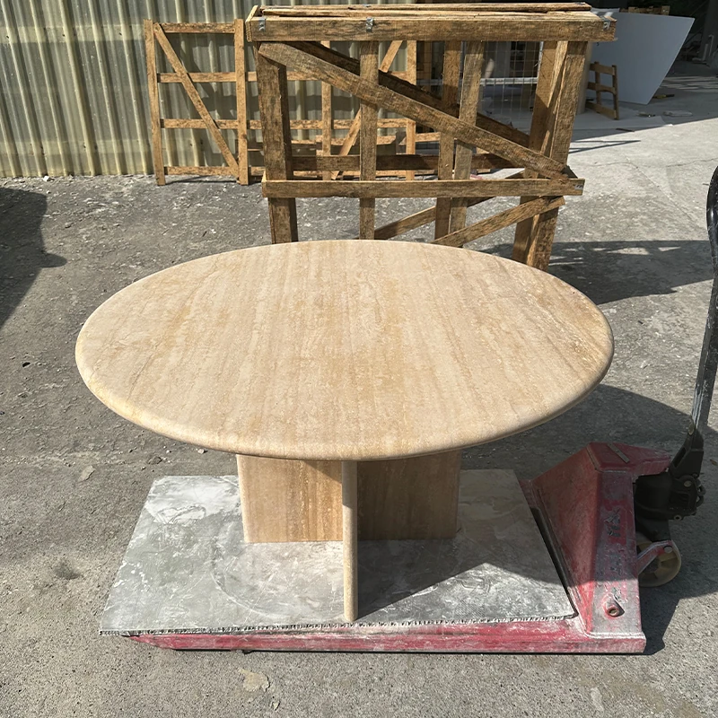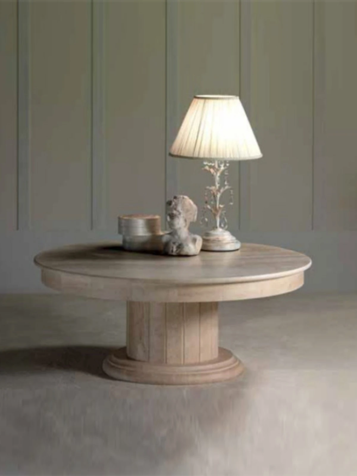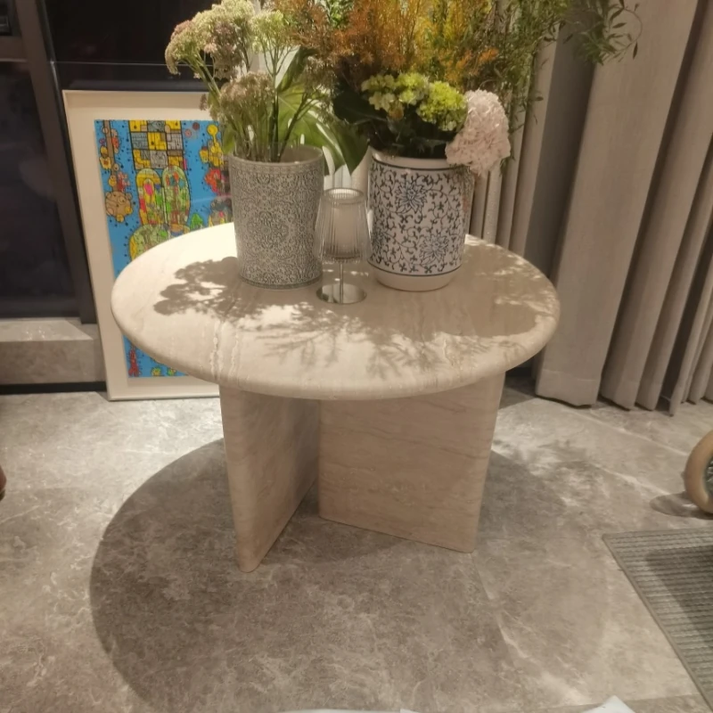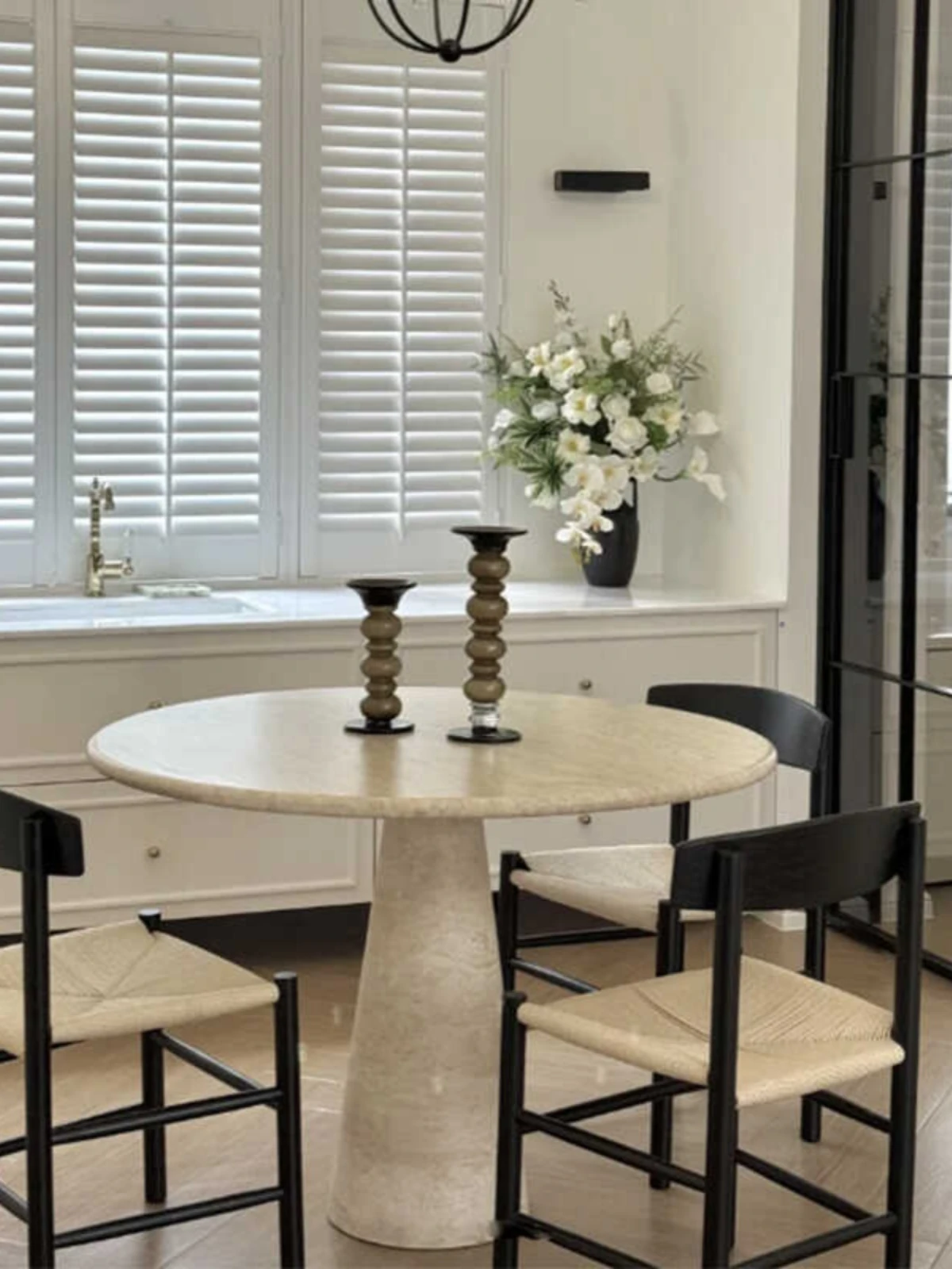 イタリアンデザインの天然洞石製ダイニングテーブル - 高級感溢れるカフェスタイル、クリーミーな侘寂の美しさを持つラウンドテーブル。あなたの空間を格上げする一品です!