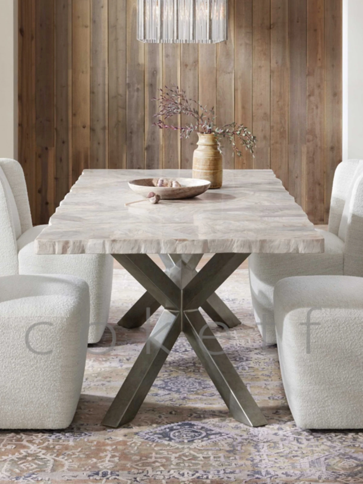 【大石】静寂の風を感じる天然洞石ロングダイニングテーブル - 北欧ミニマリズムの大理石デザイン、デザイナー推奨の会議テーブル。洗練された美しさと機能性を兼ね備えた一品。