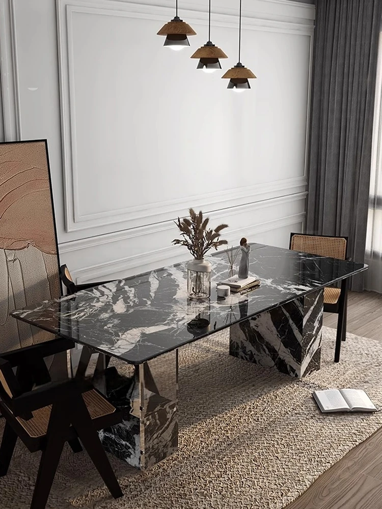 北欧風の高級感漂う長方形浮遊式ダイニングテーブル - 小型住宅に最適なデザイナーズボッカリ黒大理石製。モダンで洗練された空間を演出します!
