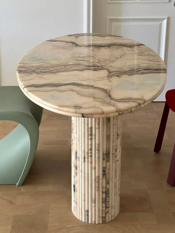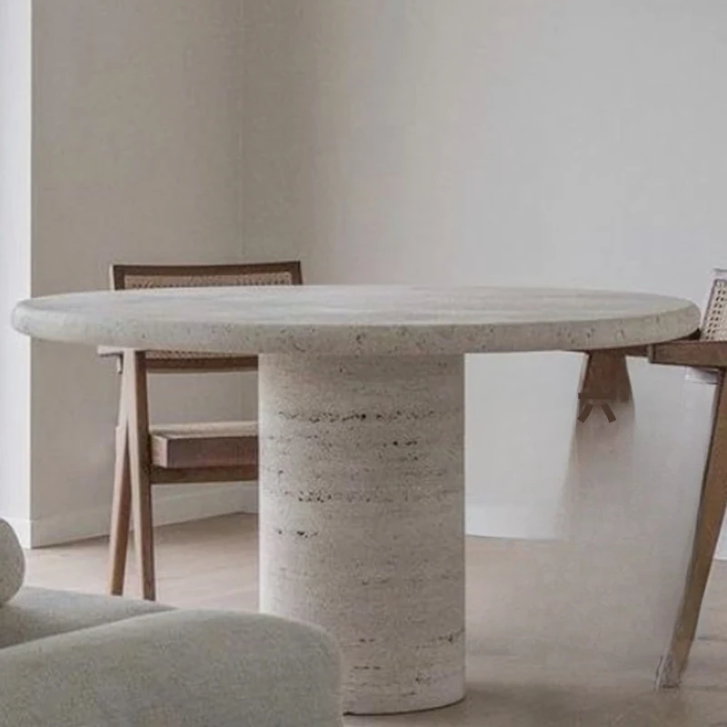 侘寂スタイルの極簡素な天然洞石大理石ダイニングテーブル - モダンな別荘サンプルルームにぴったり!洗練された円形デザインで、上質な西洋料理のひとときを演出します。