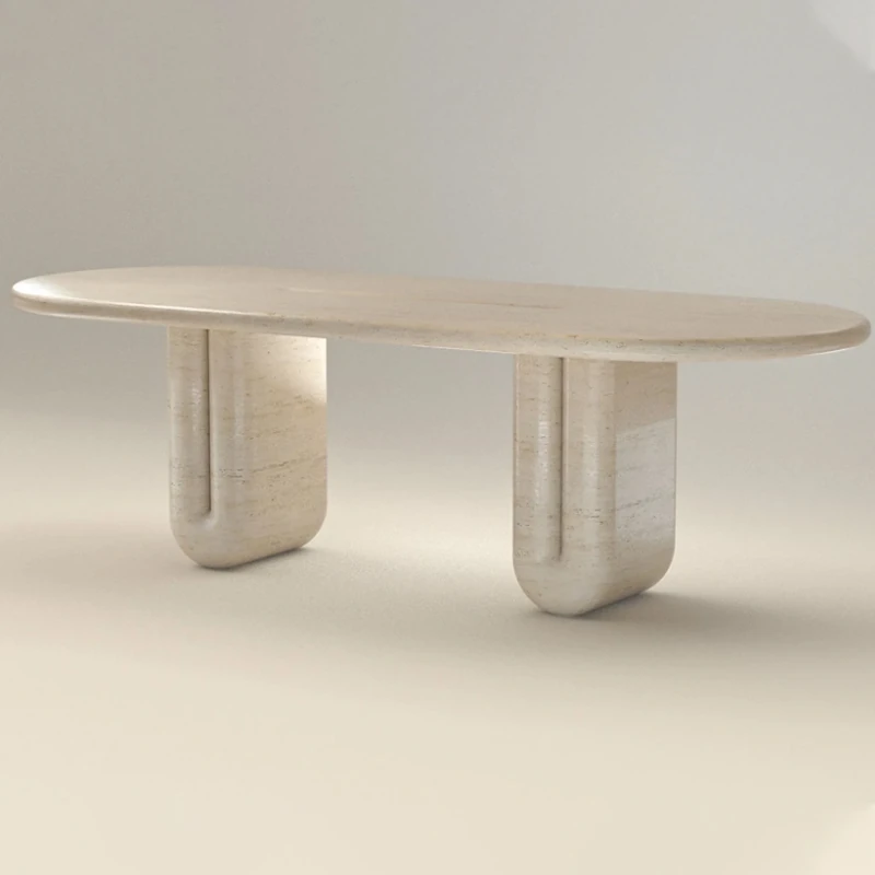 高級大理石の楕円形ダイニングテーブル - 天然素材で作られた侘寂デザインの洗練された一品。おしゃれな洞石テーブルで、特別な食事のひとときを演出します。
