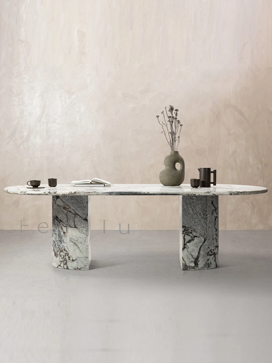 イタリアンラグジュアリー大理石オーバルデザインダイニングテーブル - 高級感あふれるホテルやヴィラにぴったりのミニマルスタイルで、特別な食事体験を演出します。