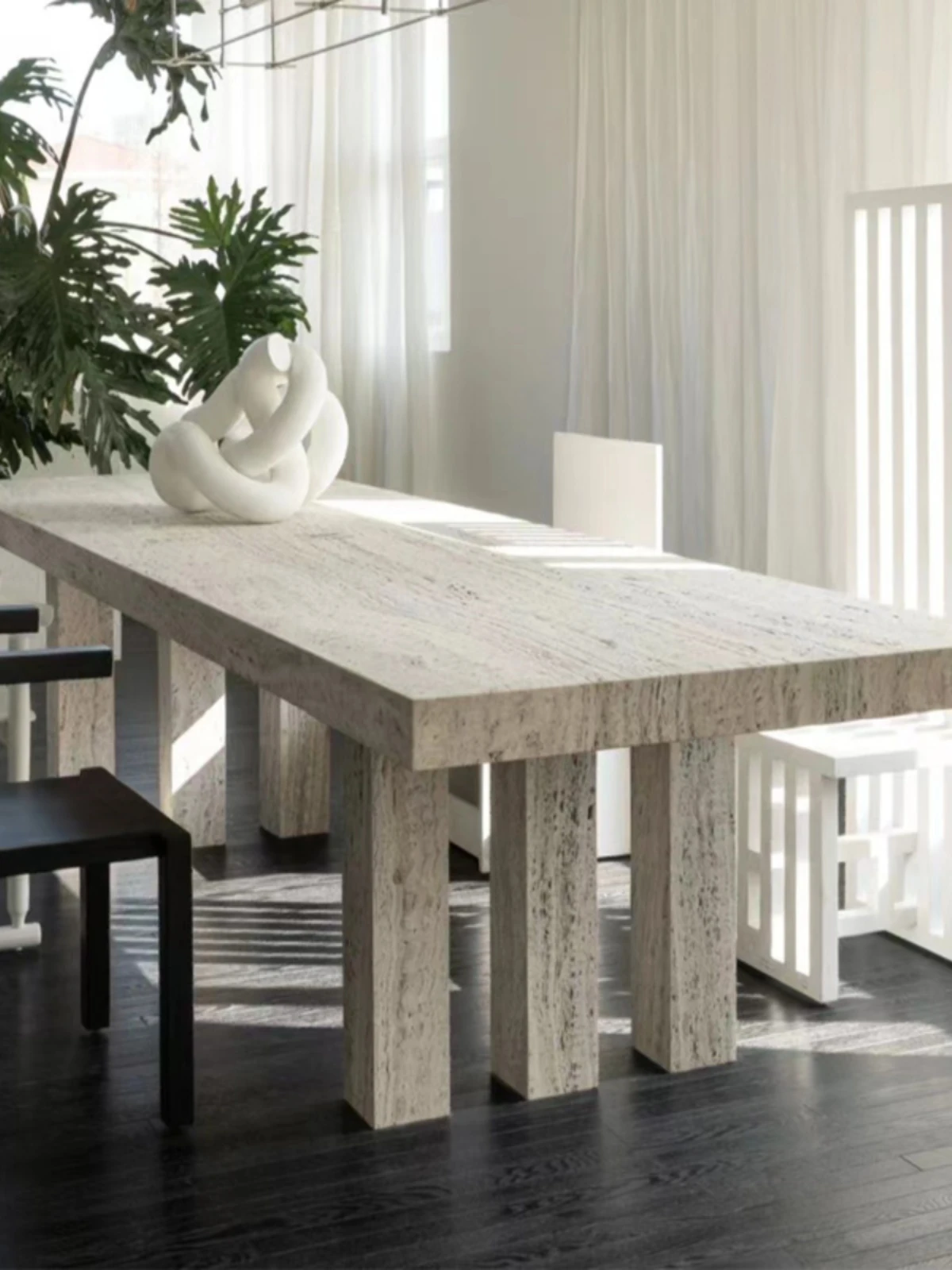 天然洞石のダイニングテーブル - イタリアンミニマリズムの魅力、別荘やホテルにぴったりのシンプルなデザイン。デザイナーが手掛けたトレンディなフレンチスタイルのロングテーブルで、特別な空間を演出します。