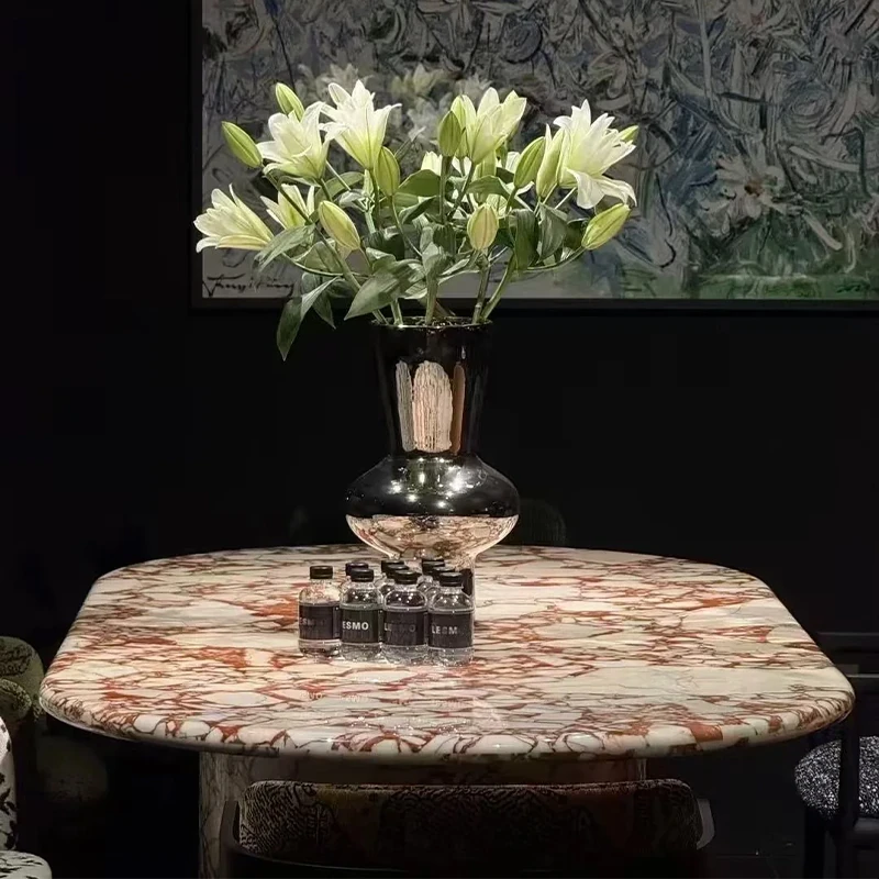 イタリア産天然レッドオブシディアンのダイニングテーブル - ラグジュアリーなリビング・ダイニングにぴったり!北欧風のエレガントなオーバルデザインで、シンプルでありながら大気を醸し出します。ホテルのような上質な空間を演出!