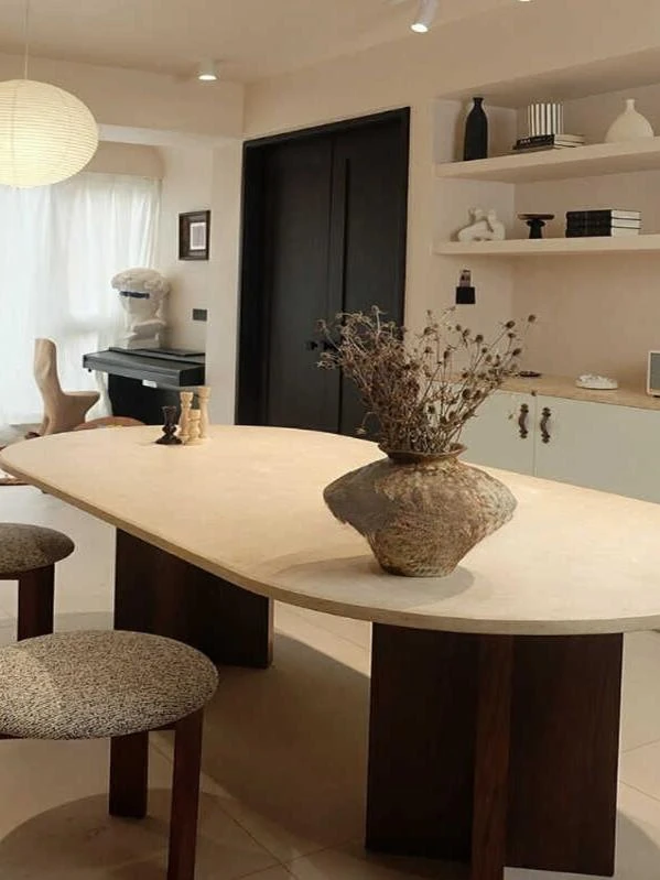 天然大理石のオーバルダイニングテーブル|中古・レトロ・侘寂風|ラグジュアリーなローマ洞石のテーブルで、上質な食卓を演出します!